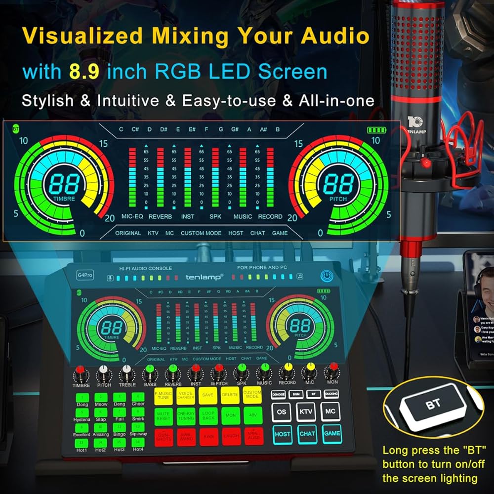 حزمة معدات البودكاست مع واجهة صوتية وميكروفون XLR بقدرة 48 فولت، وخلاط صوت Tenlamp G4Pro مع لوحة صوت بشاشة مقاس 8.9 بوصة، ومجموعة بودكاست ستوديو للهاتف والكمبيوتر والبث المباشر وتسجيل الألعاب