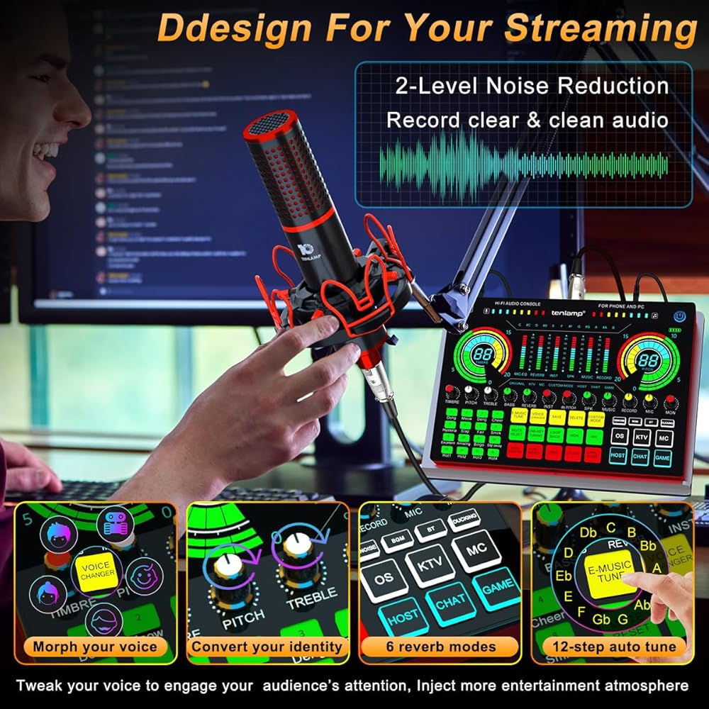 • استوديو خلاط الصوت الشامل: تتضمن حزمة ميكروفون Tenlamp G4Pro Podcast خلاط صوت للبث المباشر وميكروفون مكثف XLR. G4Pro عبارة عن خلاط واجهة صوت USB محمول الكل في واحد يسمح عبر الإنترنت بخلط الصوت والتحكم فيه في الوقت الفعلي مصادر دون إعدادات معقدة. فهو يوفر جميع العمليات المتعلقة بالصوت وسير العمل اللازم للبث المباشر وإنتاج البودكاست والتعليق الصوتي والعروض الإذاعية والتطبيقات الأخرى.