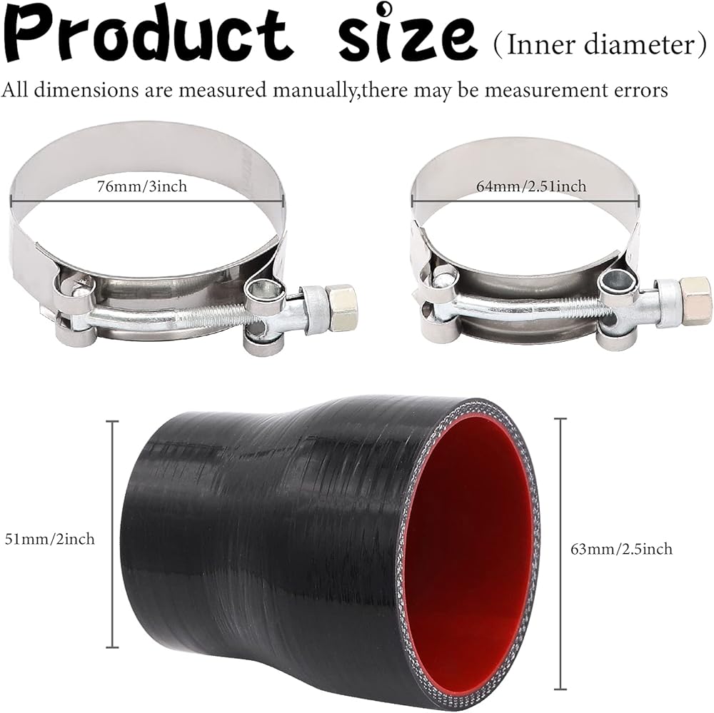 2 إلى 2-12 بوصة قارنة التوصيل المصنوعة من السيليكون الأسود 4 طبقات من تعزيز البوليستر المتوافقة مع أنابيب المبرد الداخلي لسحب الهواء وتطبيقات التوربو مع 2x T-Bolt Clamps (64 مم، 76 مم)
