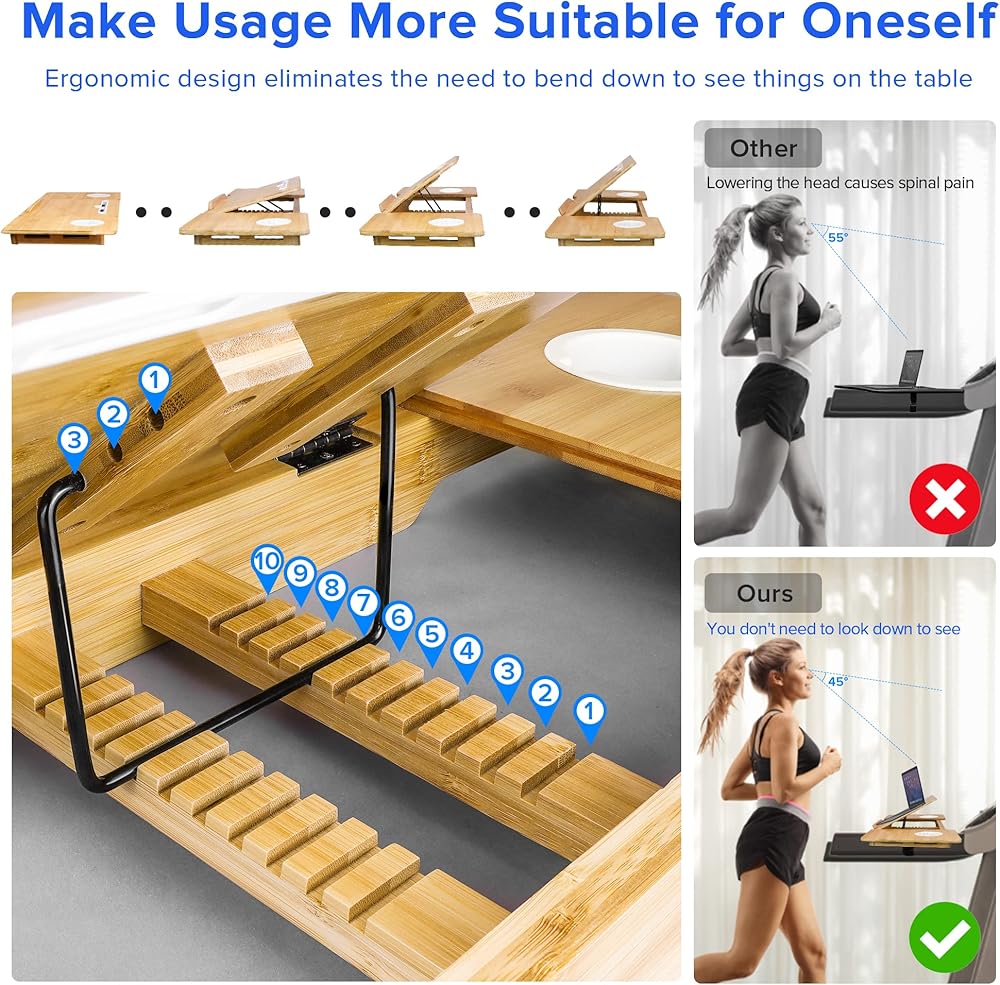 ملاءمة مثالية في كل مرة: تم تصميم محطة العمل المكتبية المريحة والقابلة للتعديل لتناسب معظم أجهزة المشي. مع عرض 33.7 بوصة وعمق 11.8 بوصة وتصميم مريح ومريح، يمكنك تثبيت الكمبيوتر المحمول والهاتف والمجلات بشكل آمن. بالإضافة إلى ذلك، تعمل صينية التصميم المبتكرة المكونة من تسع فتحات على ضبط الإمالة للحصول على رؤية مثالية، مما يساعد على منع آلام الرقبة والكتف.