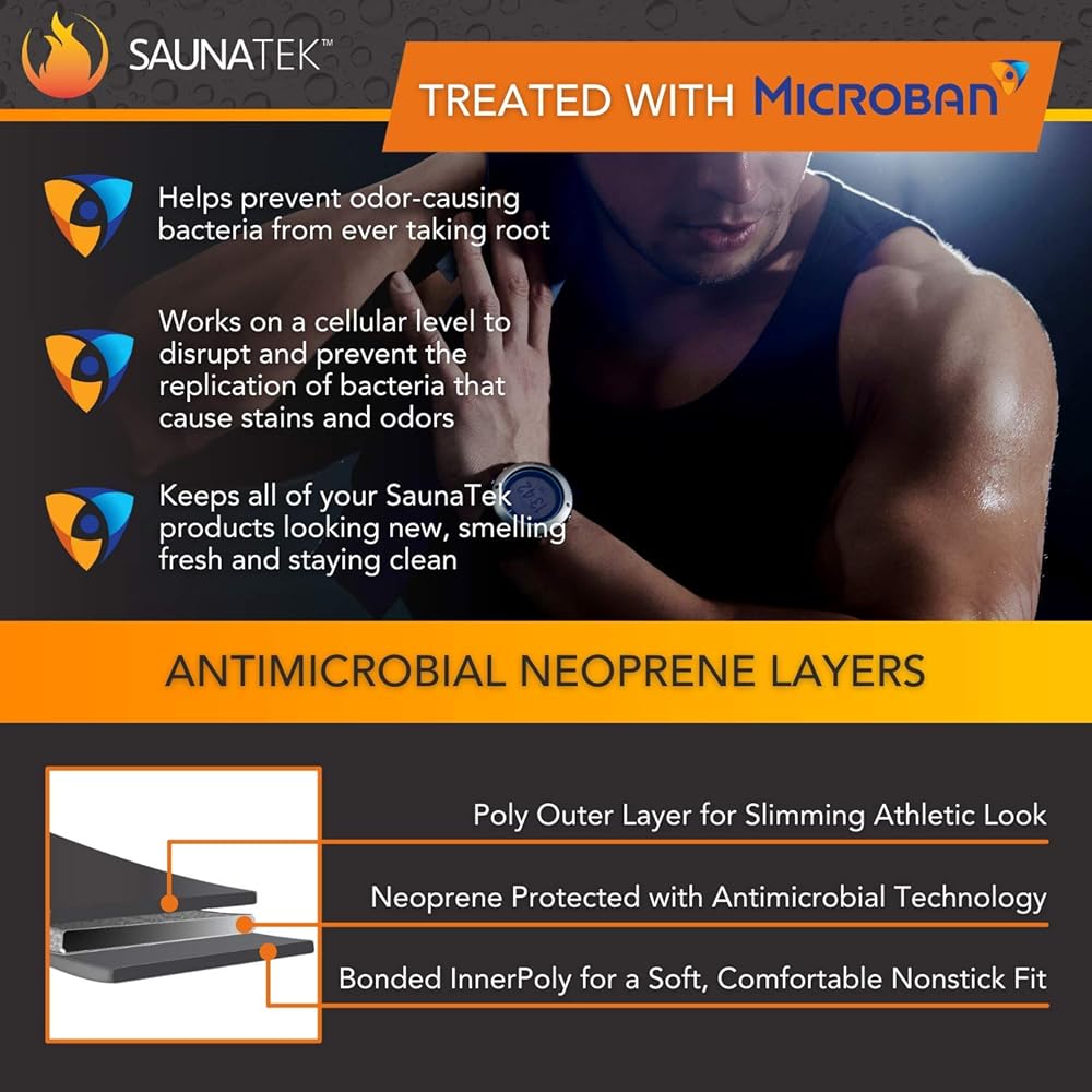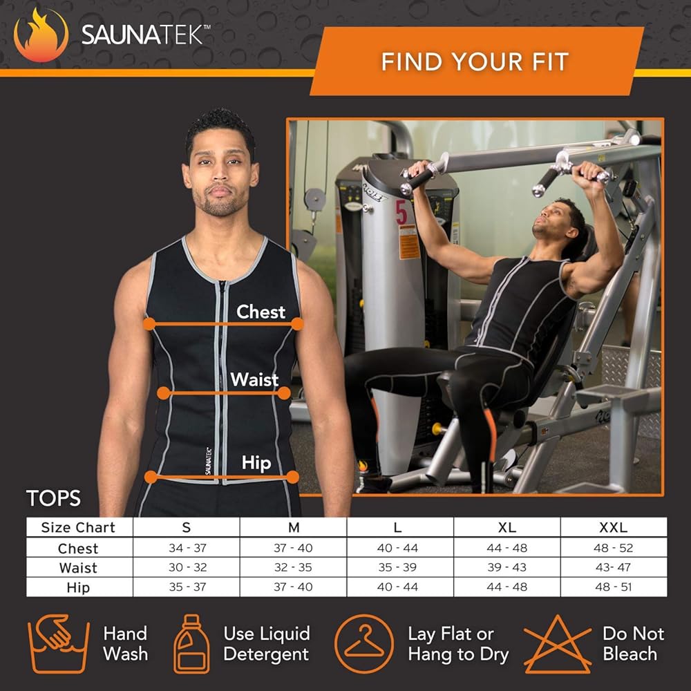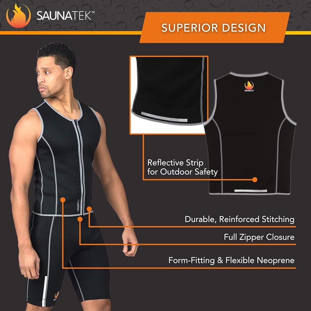 Make the most of your workout and keep your muscles and upper torso warm during your workouts with SaunaTek Men's Fat Burner Vest. This sweating suit for weight loss vest is composed of neoprene for a comfortable and durable fabric which keeps your upper body flexible to allow for a full range of motion while running, exercising, and boxing, while still keeping your body heated. Reflective lining on the exercise sauna sweatsuit vest helps to keep you visible and safe when exercising outdoors, and features Microban technology to help prevent odors and to keep your clothes fresh to allow for the best possible workout. The sauna vest suit is recommended for hand washing only.