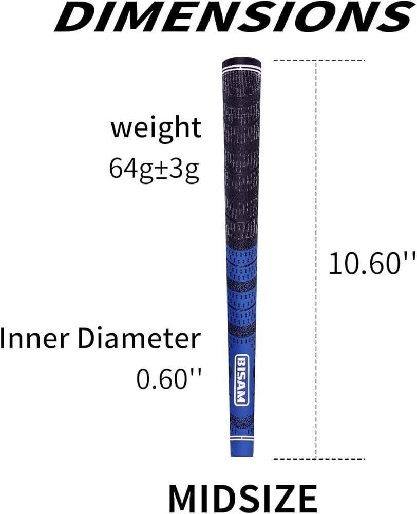 • 【Golf Grip Spec】Midsize, Core Size: R 0.60'', Grip Length: 10.60''(272mm±3mm) , Weight: 64g±3g, Package Include: 13 x BISAM Hybrid Golf Grips.