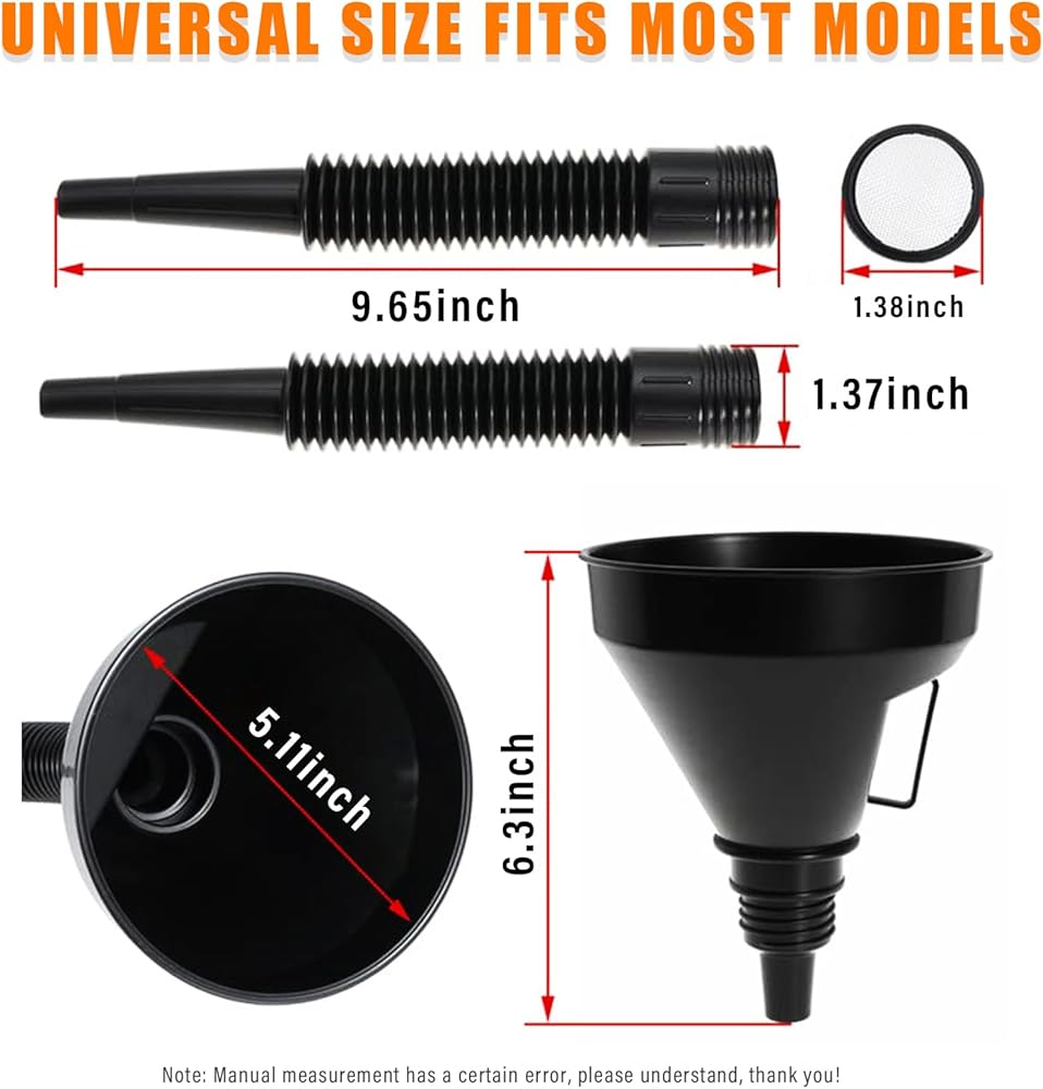 • 【Widely Use】: Our funnel with a hose is safe to use with engine oil, kerosene, diesel, gasoline, automatic transmission fluid, gear oil, hydraulic fluid, naphtha, ethylene glycol-based antifreeze, general petroleum products, isopropanol-based windshield washer fluid, DOT 5 brake fluid. It is universal and fits cars and motorcycles.