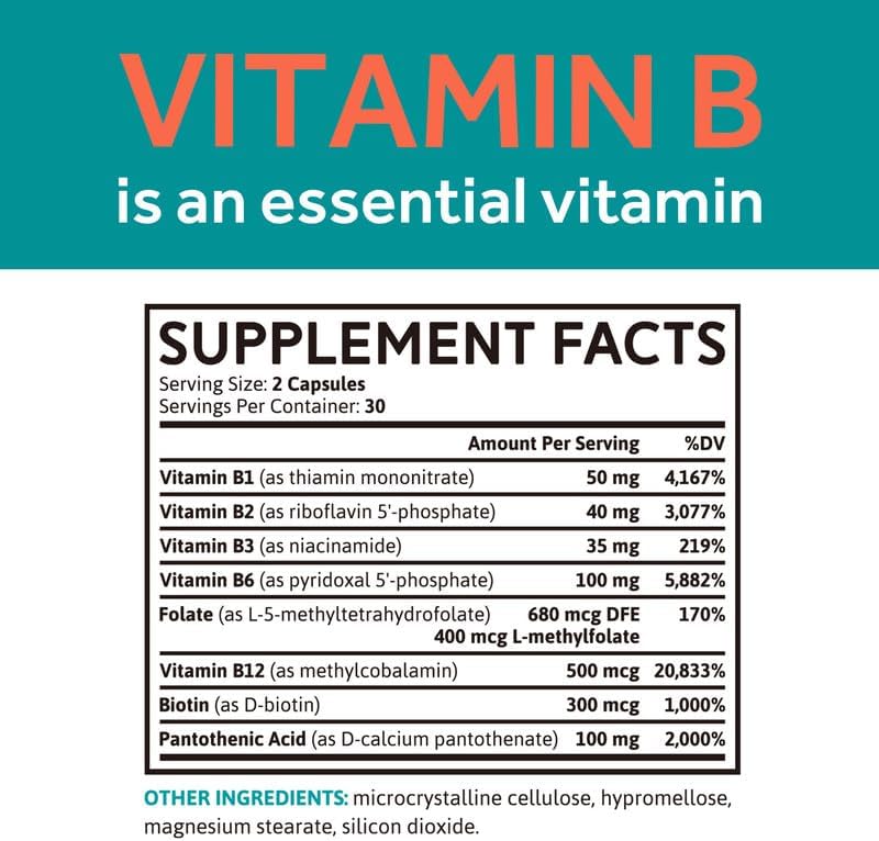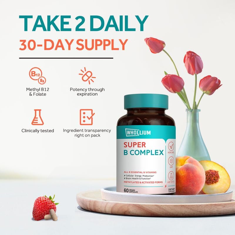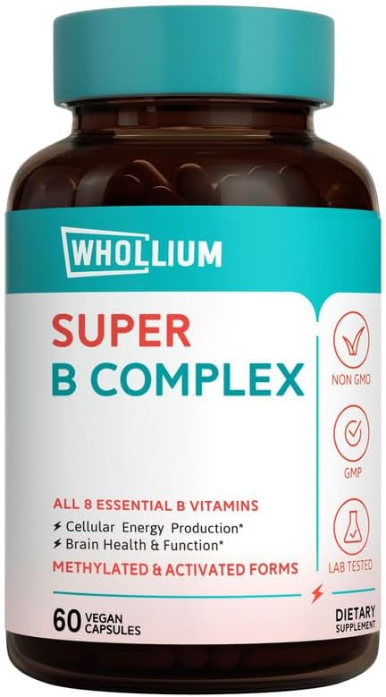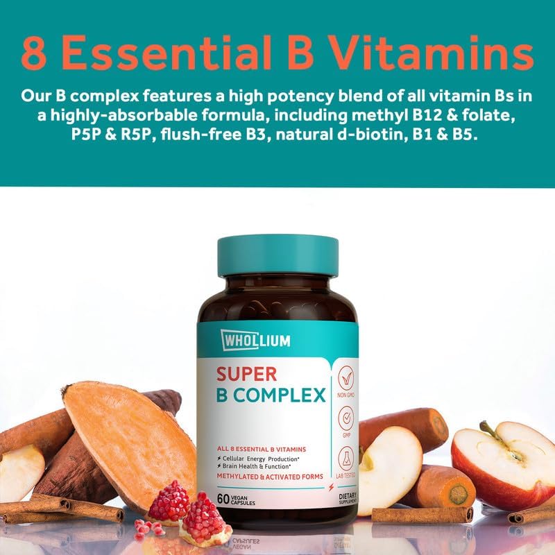 B vitamins are water-soluble and not stored in your body, so they must be replenished regularly. Whollium Vitamin B Complex features a high potency blend of all eight essential B vitamins in a highly absorbable formula, including methylated folate & B12, phosphorylated P5P & R5P, flush-free niacinamide, naturally occurring d-biotin, B1 & B5. Just 2 vegan easy-to-swallow caps per day can support your daily replenishment, boost energy production, and promote brain health & function.*