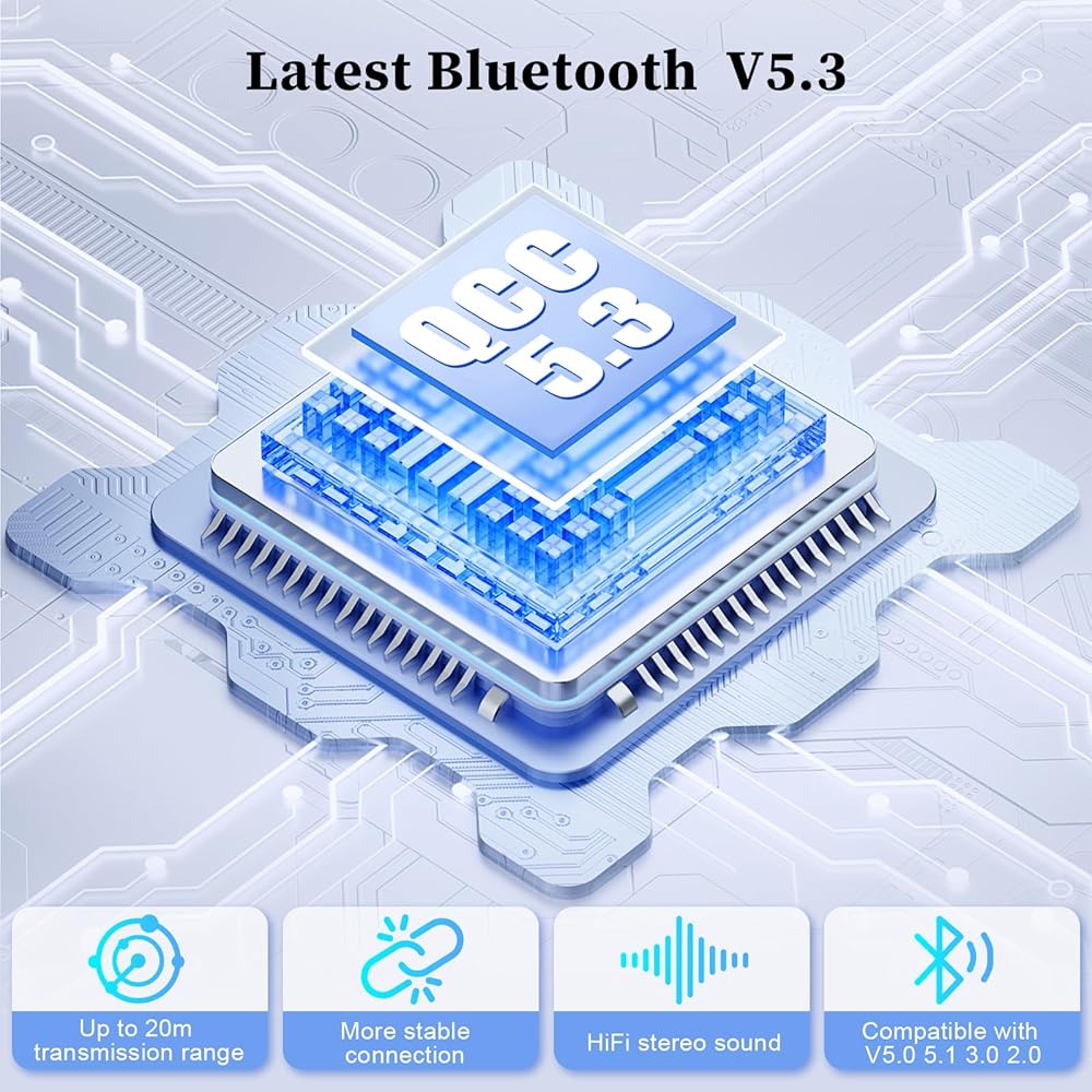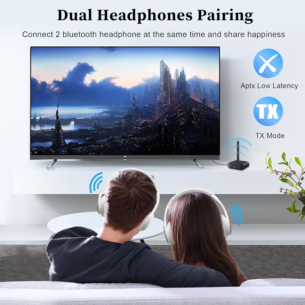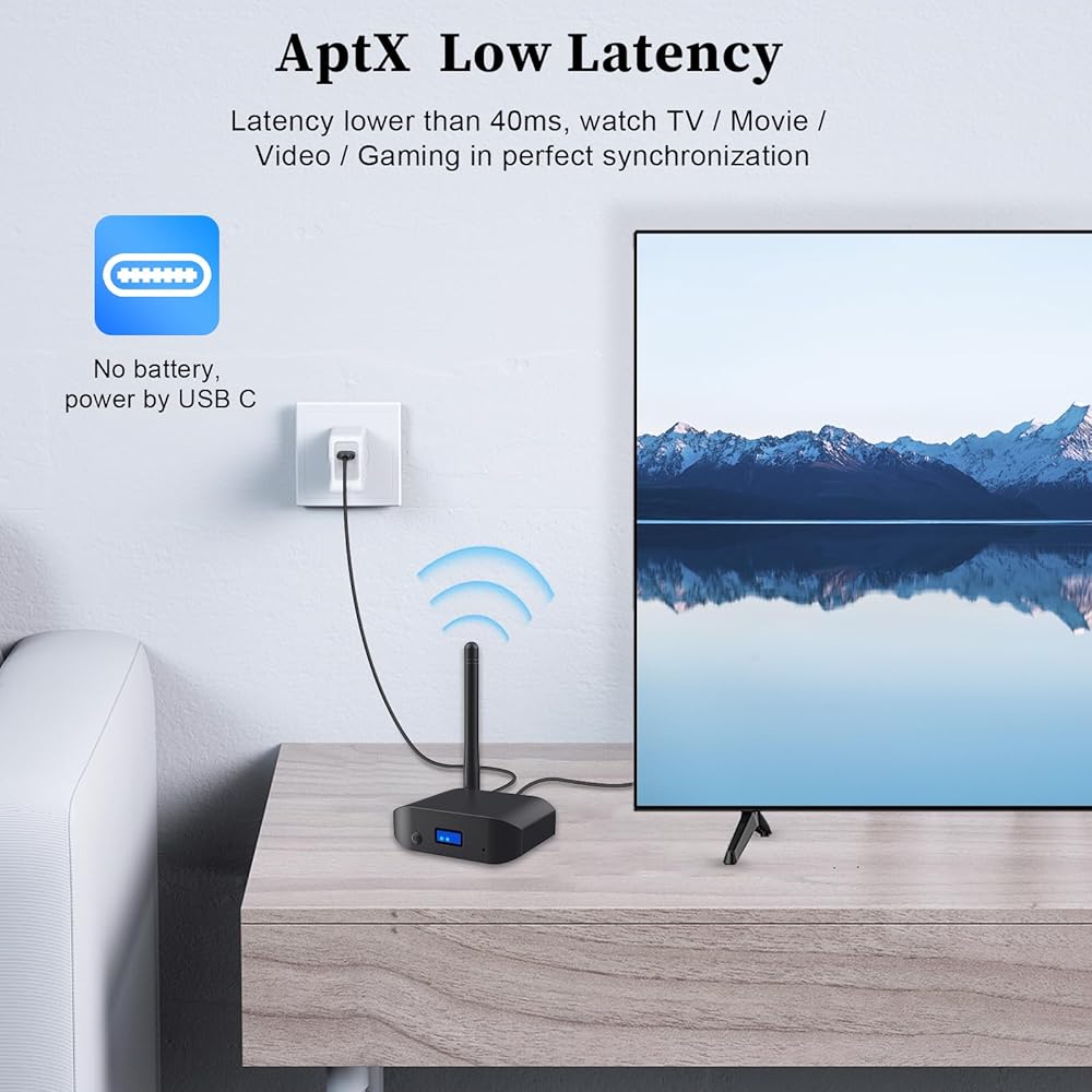 𝐁𝐥𝐮𝐞𝐭𝐨𝐨𝐭𝐡 𝟓.𝟑 & 𝐐𝐮𝐚𝐥𝐜𝐨𝐦𝐦 𝐂𝐡𝐢𝐩: يتميز جهاز إرسال التلفزيون البلوتوث بأحدث تقنيات Bluetooth V5.3 وشريحة Qualcomm، ويدعم SBC، AAC ، aptX، aptX-LL، بروتوكولات aptX-HD. يضمن Bluetooth 5.3 اتصالاً سريعًا بأجهزتك ويوفر اتصالاً فائق الاستقرار يصل إلى نطاق 20 مترًا لتجربة استماع خالية من المتاعب.