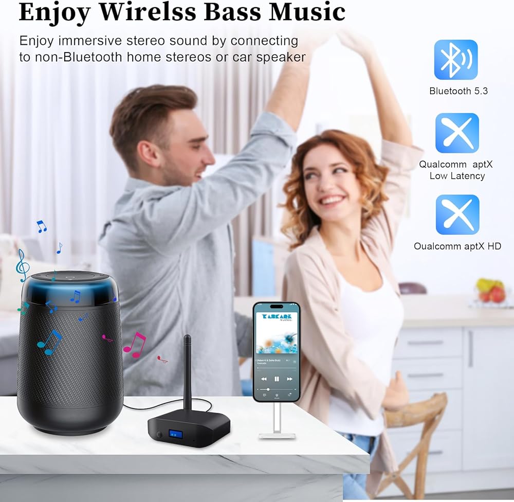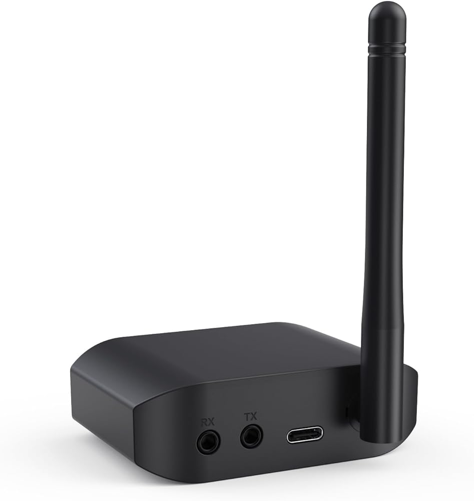 𝟐-𝐢𝐧-𝟏 𝐁𝐥𝐮𝐞𝐭𝐨𝐨𝐭𝐡 𝐓𝐫𝐚𝐧𝐬𝐦𝐢𝐭𝐭𝐞𝐫 𝐑𝐞𝐜𝐞𝐢 𝐯𝐞𝐫: في وضع TX، يقوم جهاز إرسال بلوتوث بتوصيل مصادر الصوت غير بلوتوث مثل أجهزة التلفاز أو الكمبيوتر الشخصي أو الطائرات، بمكبرات صوت بلوتوث، وسماعات الرأس عبر كابل Aux 3.5 مم، لمشاهدة التلفزيون، ولعب الألعاب دون إزعاج الآخرين . في وضع RX، يستقبل جهاز استقبال Bluetooth الصوت من الهاتف الذكي ثم ينقل الصوت إلى مكبرات الصوت السلكية غير المزودة بتقنية Bluetooth، وأجهزة ستريو السيارة/المنزل، وسماعات الرأس عبر كابل AUX مقاس 3.5 مم لبث الموسيقى لاسلكيًا.