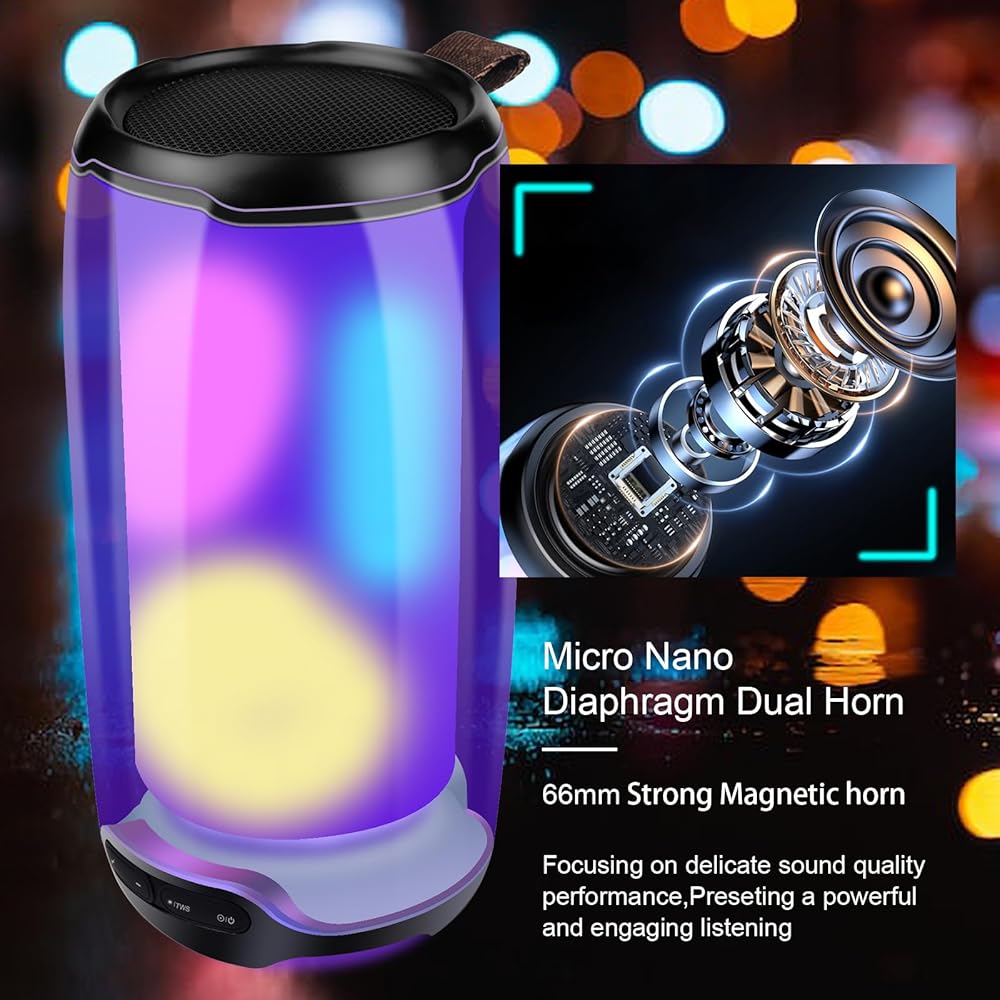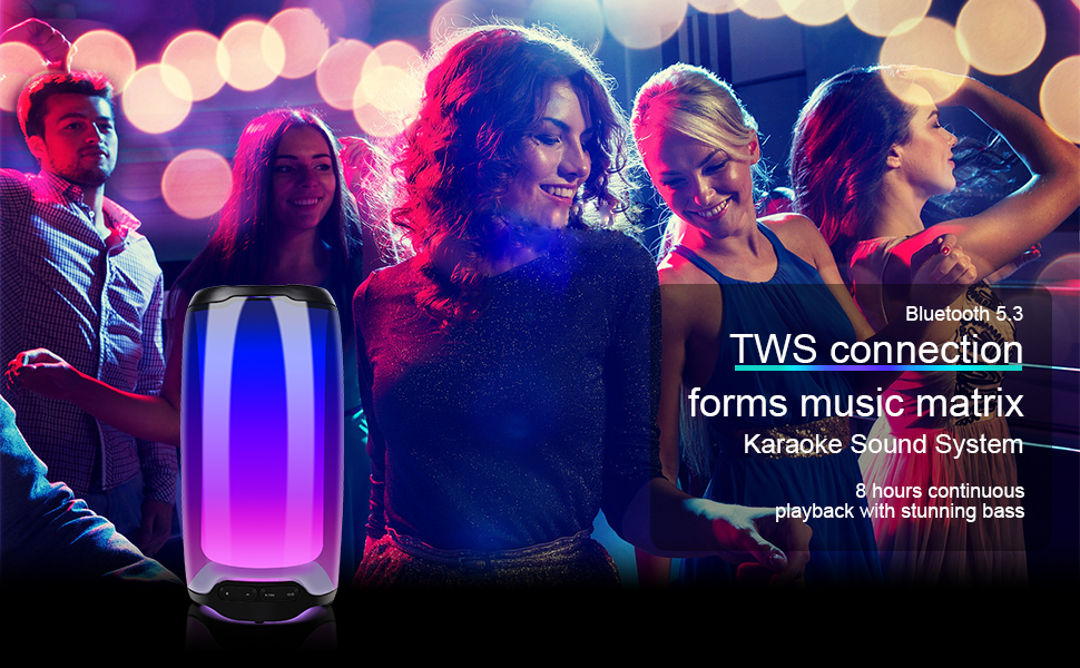 【 اقتران خيارات اتصال متعددة/TWS 】تتيح لك إمكانية البلوتوث المدمجة توصيل أجهزتك، مثل الهواتف الذكية أو الأجهزة اللوحية، دون عناء. يمكنك الوصول بسهولة إلى أغانيك المفضلة من خدمات البث أو مكتبتك الشخصية. تضيف مصابيح LED عنصرًا مرئيًا رائعًا إلى مكبر الصوت الخاص بك. إنها تخلق جوًا احتفاليًا وترفع من مستوى التجربة بشكل عام، خاصة أثناء التجمعات الليلية.