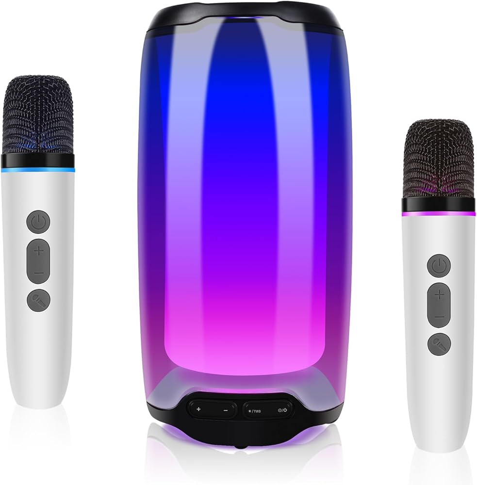 【ميكروفونات لاسلكية مزدوجة/صوت سحري للغناء المزدوج】جهاز الكاريوكي المزود بميكروفونين بلوتوث هو انفجار مطلق، ميكروفونات مزدوجة وإقران: إن تضمين اثنين من ميكروفونات البلوتوث يعني أن الثنائي والغناء الجماعي أمر سهل. يضمن الاقتران مزامنة سلسة بين الميكروفونات، مما يسمح بأداء متناغم. وهو أمر ضروري لأي شخص يحب الغناء أو استضافة الحفلات أو يحتاج فقط إلى مكبر صوت بلوتوث لائق.
