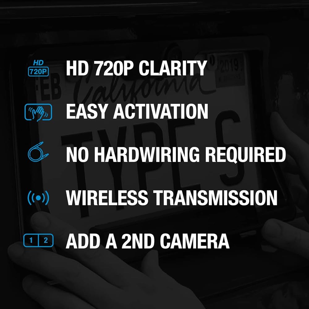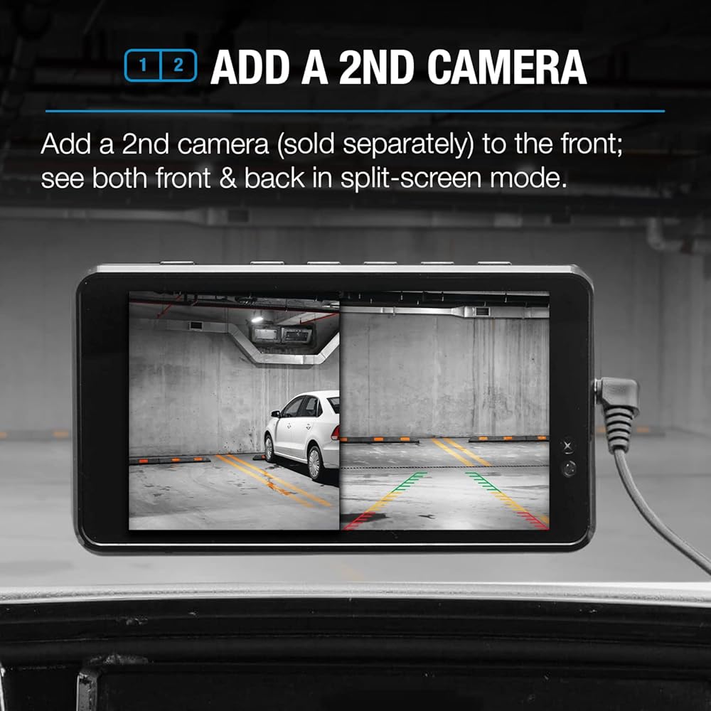 [Smart Parking Assistant] Parallel parking is no longer a headache; the TYPE S backup cam not only comes with crystal clear 720P HD resolution, but also accurate parking gridlines that will help get you into even the tightest spots within seconds. An optional add-on 2nd camera (sold separately) can be added to the front and viewed in split-screen mode.