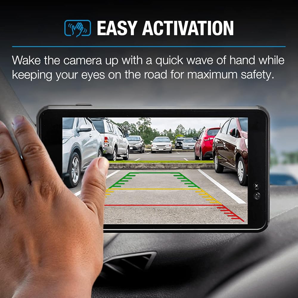 [Easy Motion Activation] This portable backup camera is designed with you and the passengers' safety in mind. Wake the camera up without having to take your eyes off the road, anytime you want. All you need to do is a simple wave of hand in front of the monitor and real-time HD 720P footage will instantly be shown on the display.
