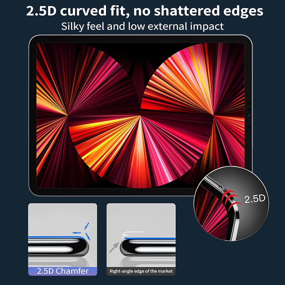 12.9 inch iPad pro screen protector original smooth touch: iPad pro 12.9 6th generation screen protector is 0.3mm thin, 9H hardness tempered glass, ultra-thin ultra-clear glass naturally blends into the screen, covering the entire screen from the edges without affecting the line of sight. 2.5D smooth edges and rounded corners are designed to improve finger and hand comfort.