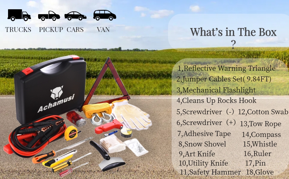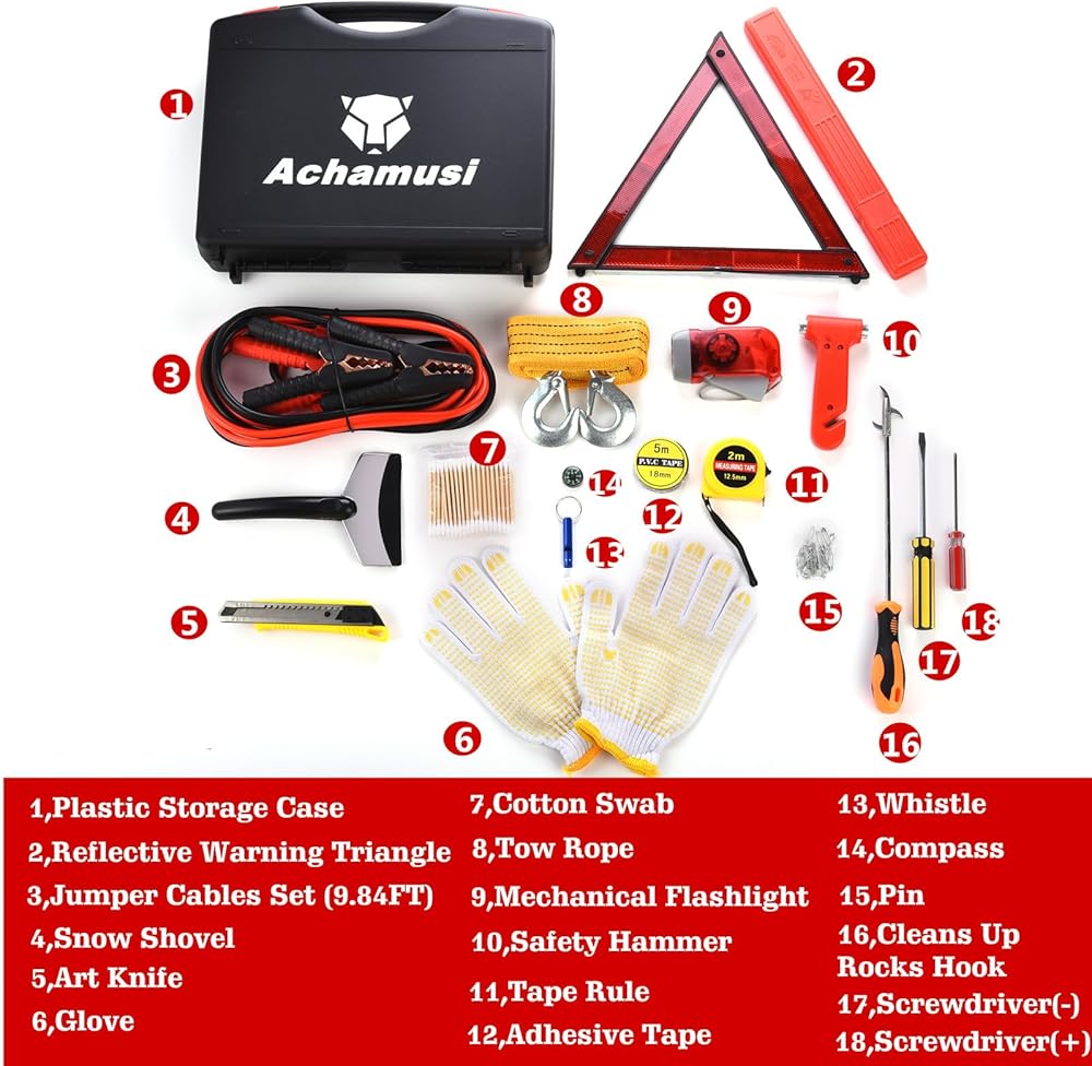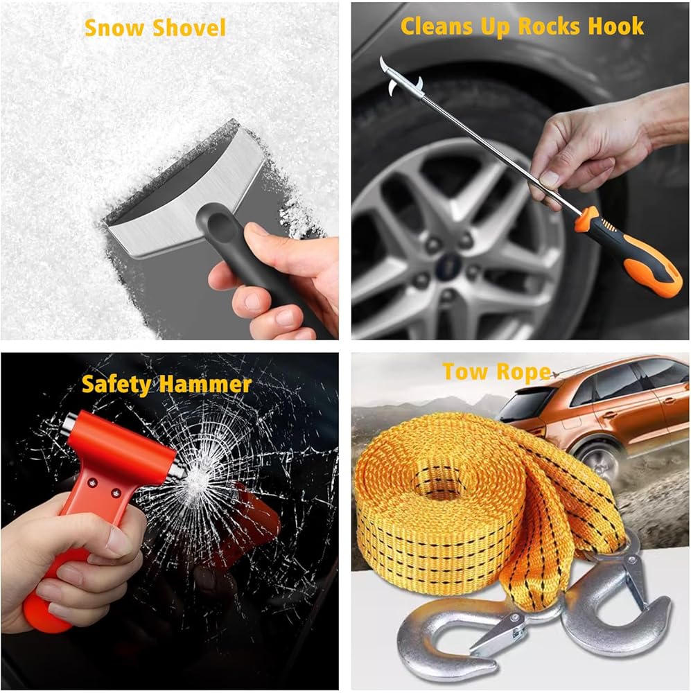 مناسبة لمعظم حالات الطوارئ: تحتوي العلبة على كابلات قفز، وحبل سحب، ومطرقة أمان، وقفازات أمان، ومصباح يدوي ميكانيكي، ومفك براغي، وخطاف تنظيف الصخور، ومجرفة ثلج، ومثلث تحذير عاكس والمزيد.
