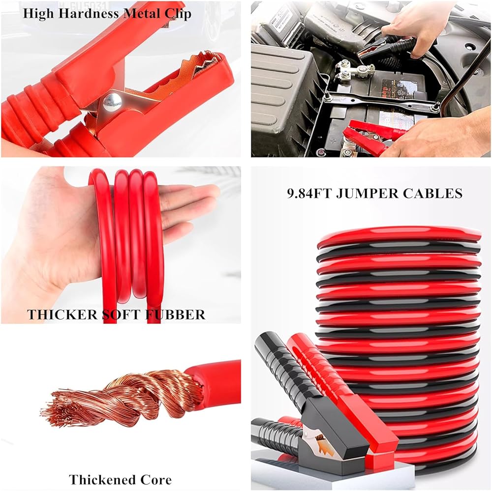 مجموعة الإنقاذ في حالات الطوارئ: تحتوي جميع الأدوات على مواقع منفصلة لسهولة التخزين وتوفير المساحة. كابلات التوصيل مصنوعة من النحاس النقي لإعادة سيارتك إلى وضعها الطبيعي بسرعة. إنها مجموعة أدوات سلامة السيارة التي يجب اقتناؤها لجميع السائقين، لذلك يمكنك دائمًا الشعور بالأمان والأمان أثناء قيادة سيارتك.
