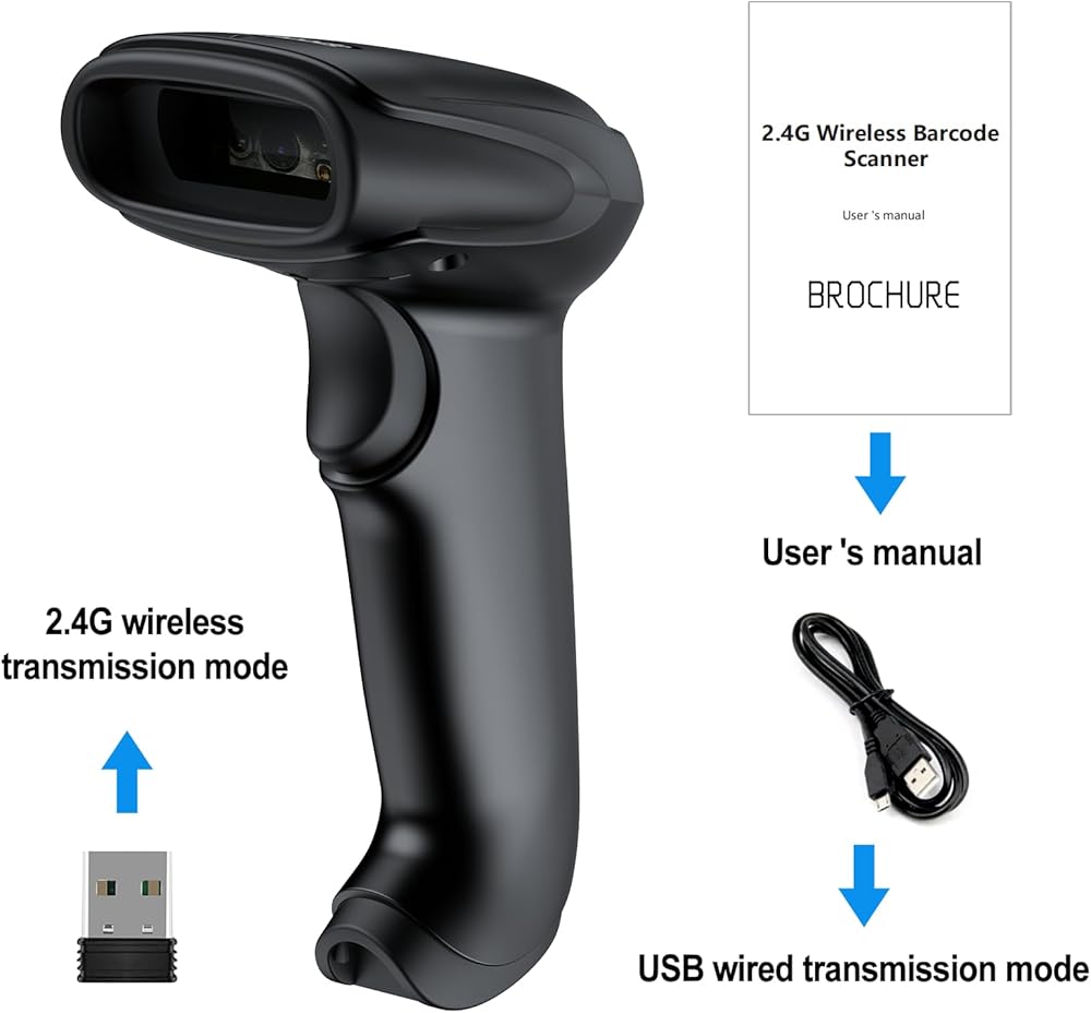 What's Included: Barcode Scanner (Model: MJ-6706DA-Black); Charging Cord; and a User Manual.