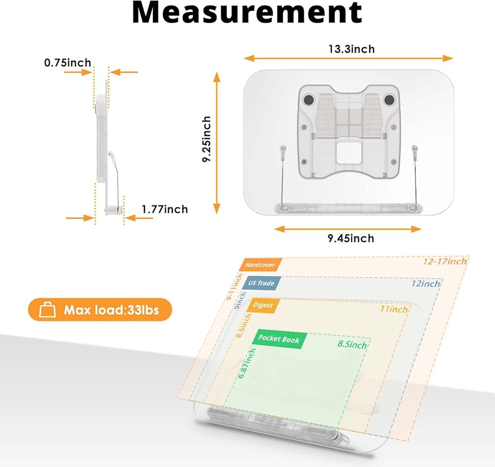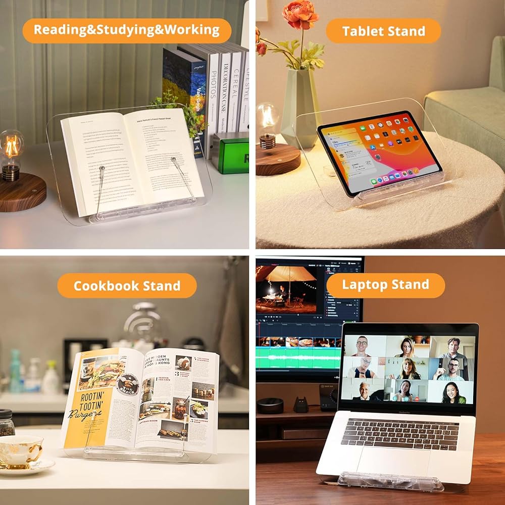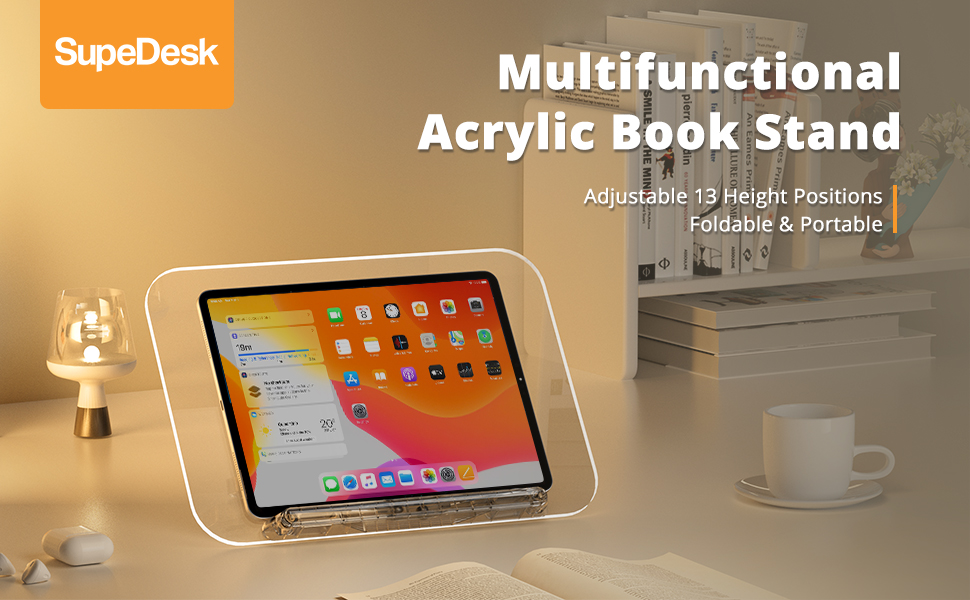 【قابلة للطي والحمل】مصنوعة من الأكريليك الشفاف خفيف الوزن وتزن 1.65 كجم فقط. يبلغ حجم حامل الكتب SupeDesk حوالي 9.5*13.4*1.7 بوصة عند طيه، وهو حجم يمكن حمله في حقيبة كبيرة. يمكن استخدام حامل الكتب هذا للقراءة في مواقف مختلفة مثل المنزل، المطبخ، الشرفة، غرفة العمل، الفصل الدراسي، المكتبة، المقهى، المكتب، إلخ.