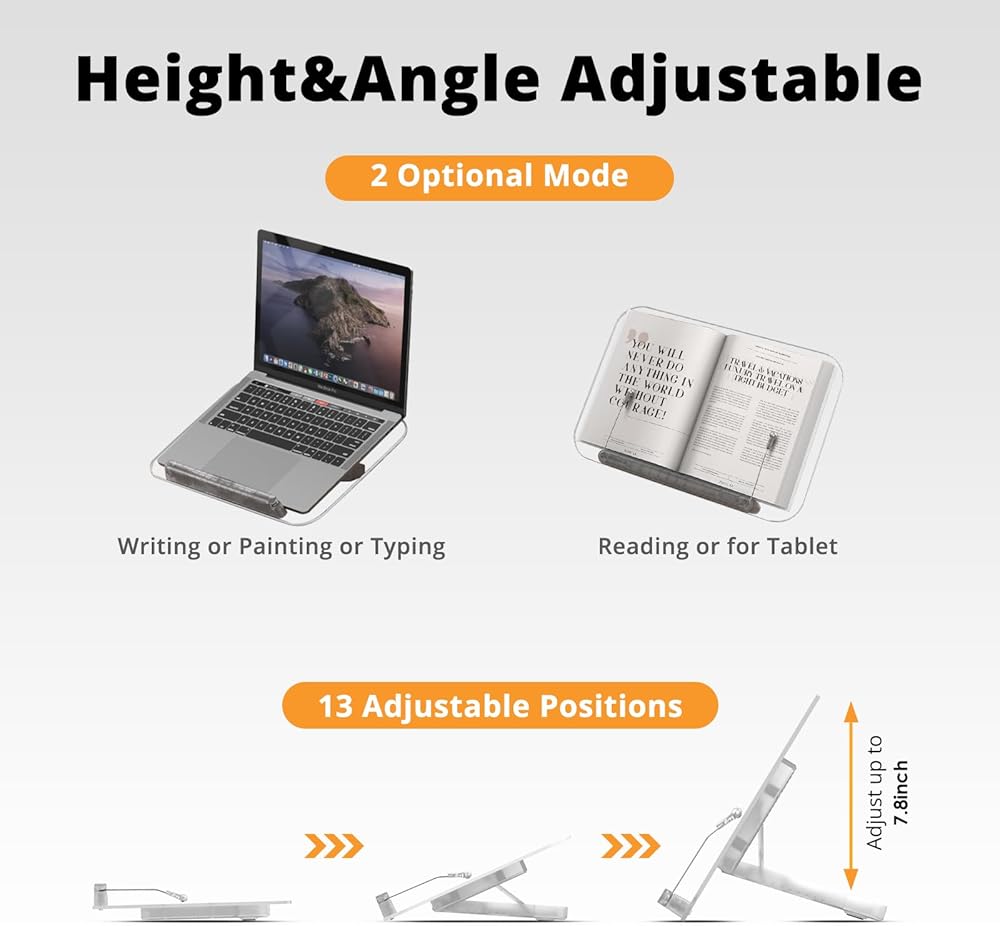 【13 وضعية ارتفاع قابلة للتعديل】يمكن تعديل حامل الكتب SupeDesk في 13 وضعية للارتفاع، مما يوفر زوايا مختلفة لأغراض مختلفة. يمكن استخدام الوضع من 1 إلى 5 كمنصة مائلة للدراسة، ويمكن استخدامه أيضًا كحامل للكمبيوتر المحمول. تم تصميم طول جزء سدادة الكتاب لمنع الاصطدام بمعصمك أو ذراعيك عند الكتابة أو الكتابة. تعتبر الأوضاع من 6 إلى 9 مثالية للقراءة، بينما تعتبر الأوضاع من 10 إلى 13 مناسبة للرسم أو حمل الكمبيوتر اللوحي.
