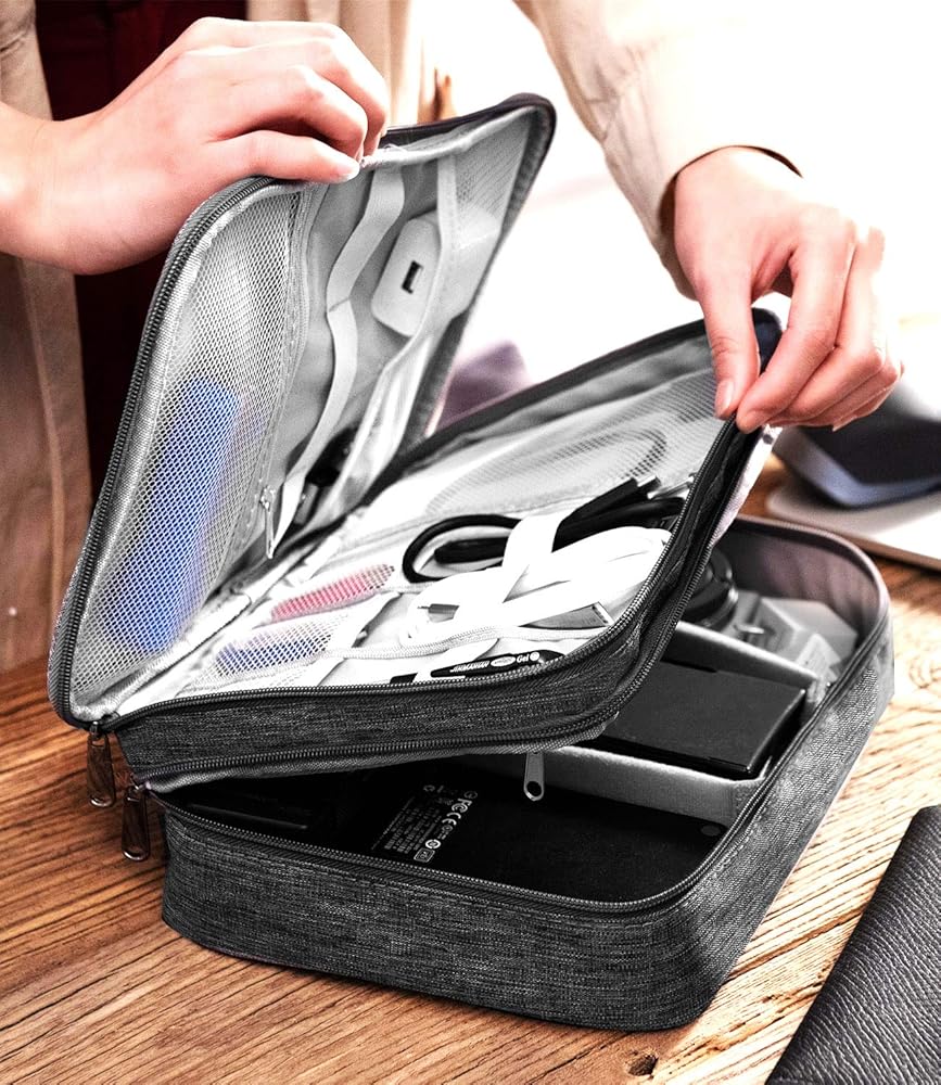 【تفاصيل مثالية】تستخدم حقيبة تنظيم الكابلات سحابًا مزدوجًا، ويمكن فتح السحاب وإغلاقه بحرية. تساعدك على استخدامه أكثر سهولة. لا تحمي حقيبة تخزين الكابلات ملحقاتك الإلكترونية فحسب، بل تقوم أيضًا بتخزين القلم والحبوب وفرشاة المكياج ومستحضرات التجميل. يُعد منظم الإلكترونيات هذا هدية مثالية للرجال والنساء لاستخدامه كمجموعة سفر أو مجموعة أعمال.