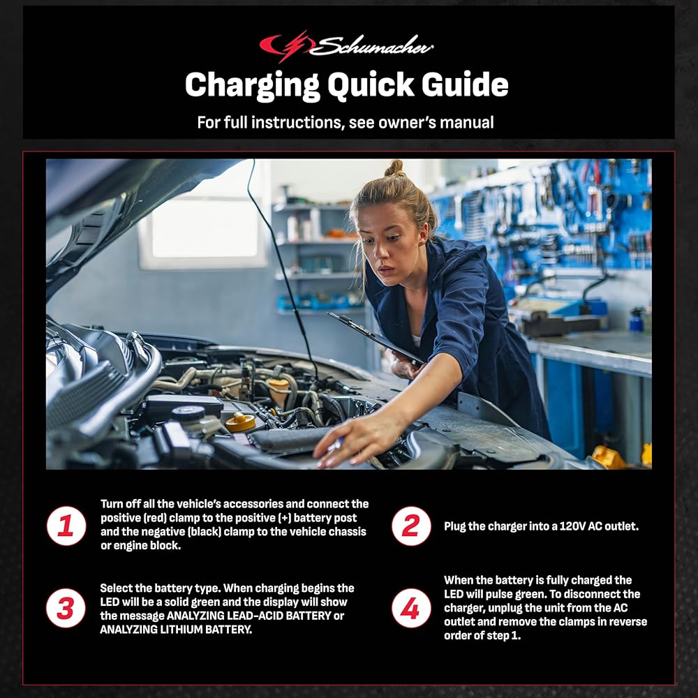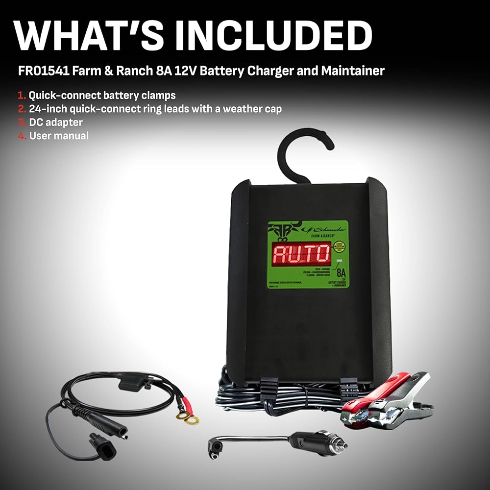 • IN THE BOX: Schumacher Farm & Ranch 8A 12V Battery Charger and Maintainer, quick-connect battery clamps, 24-inch quick-connect ring leads with a weather cap, DC adapter, and user manual
