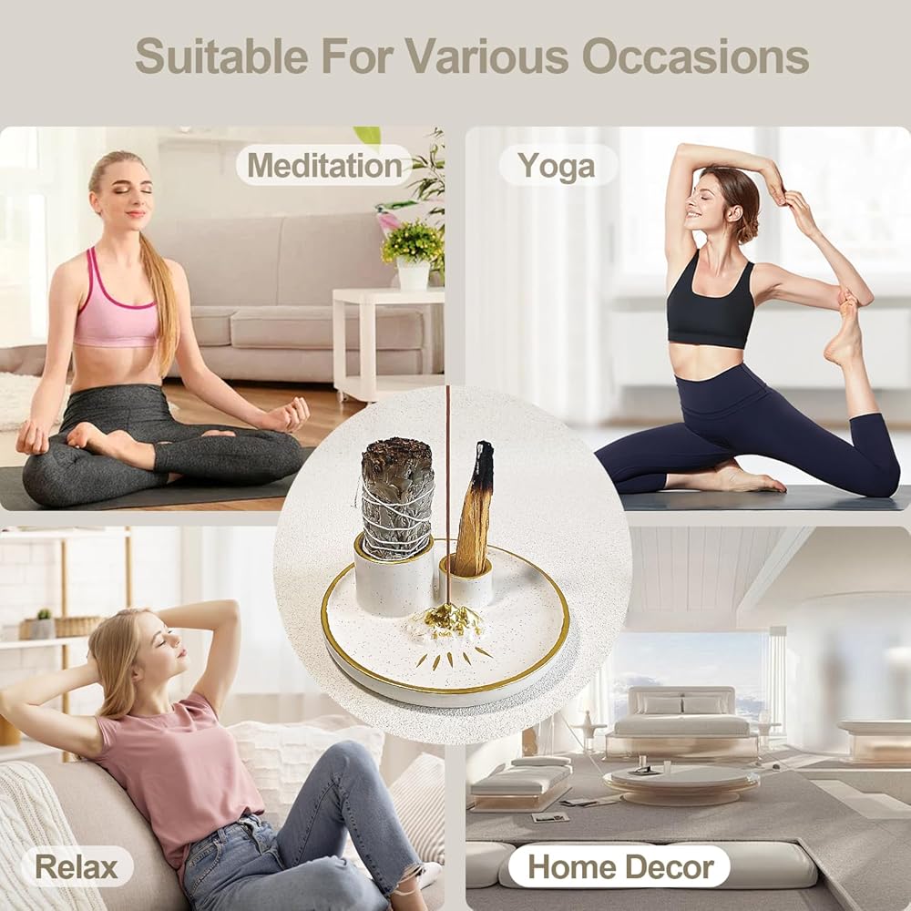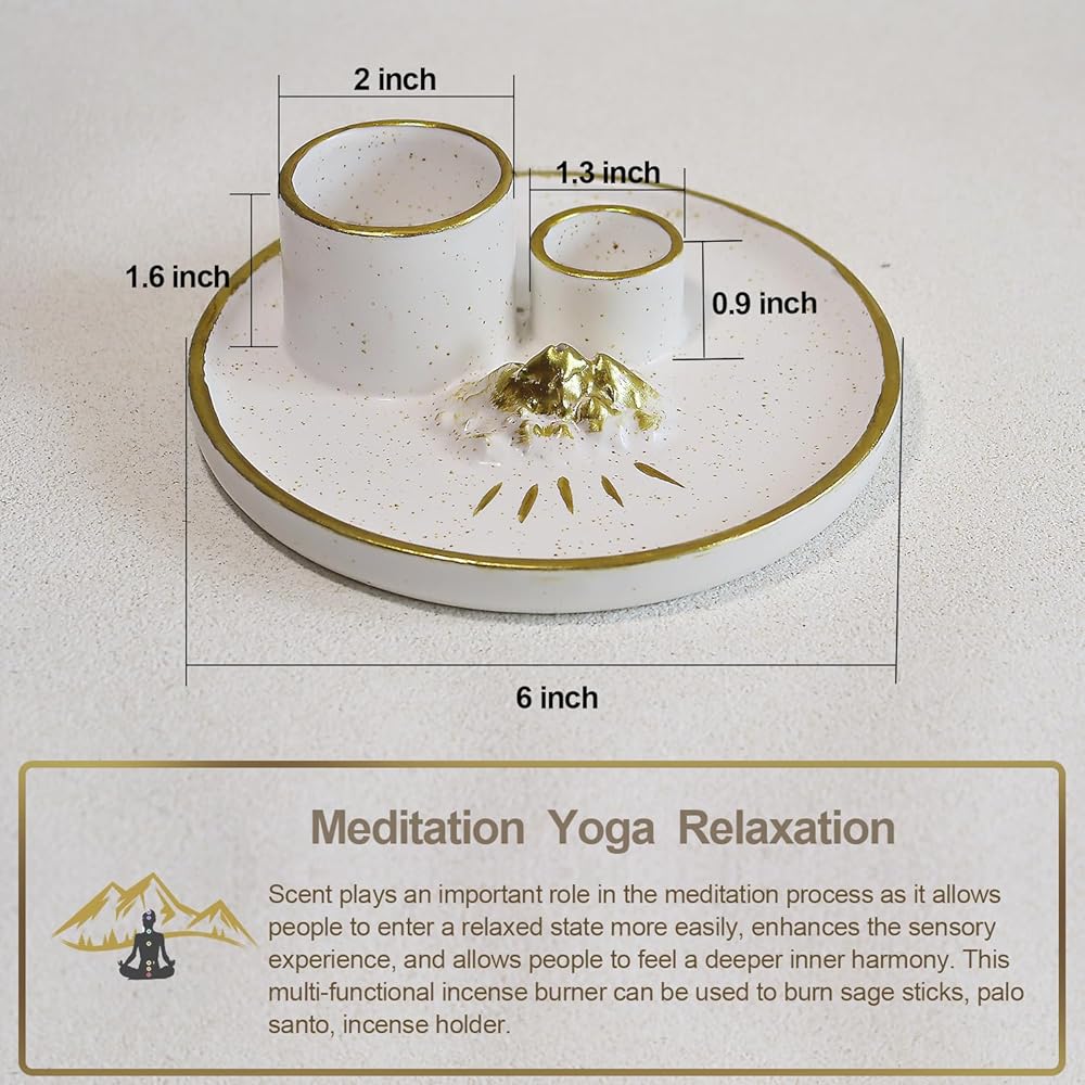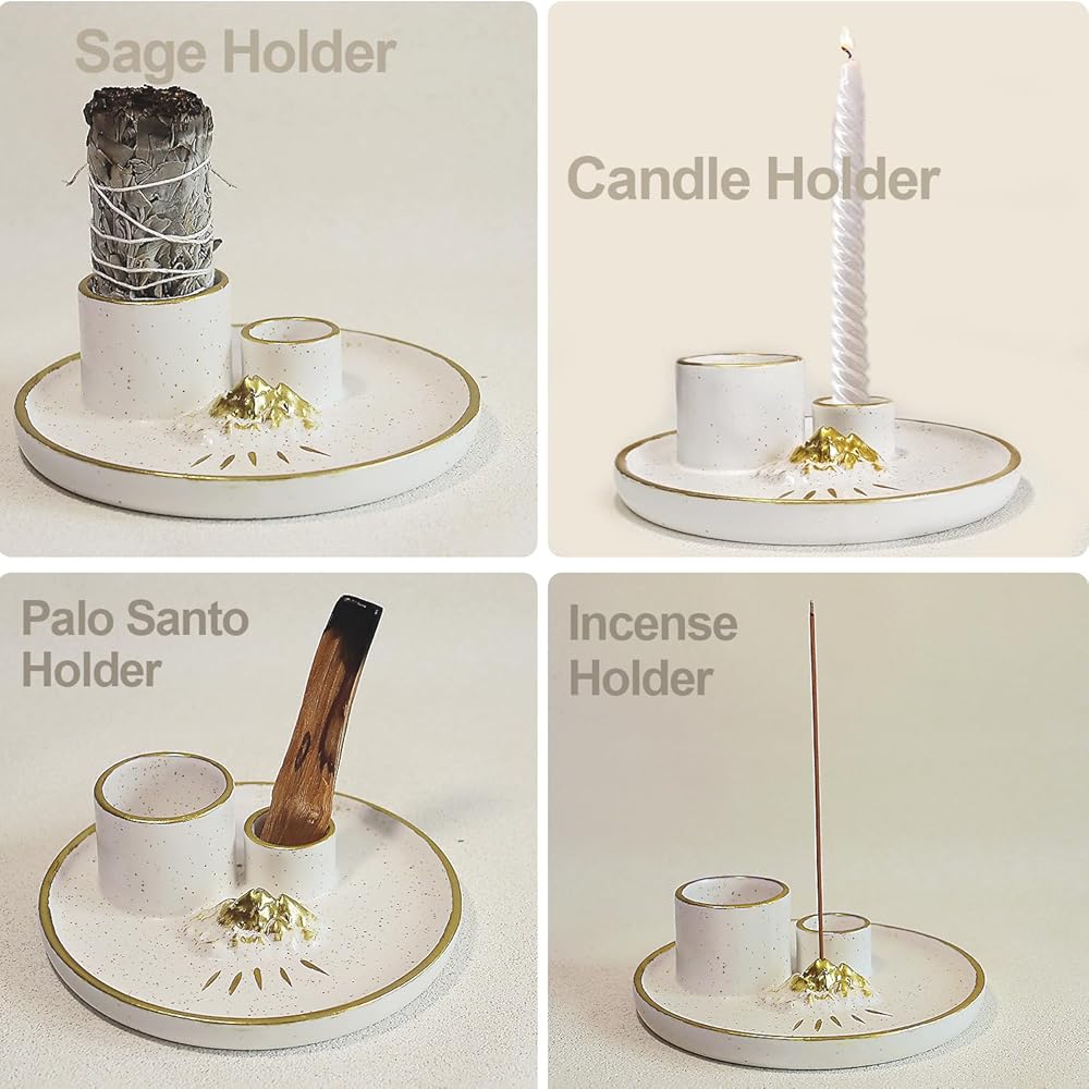 تصميم 4 في 1: يمكن استخدام حامل البخور متعدد الوظائف هذا كموقد بخور، وموقد بالو سانتو، وموقد حكيم، وحامل شموع. شكل التل يذكرنا بالطبيعة ويرتبط بالتأمل، وحفر البخور الموجودة على التل. حامل بالو سانتو 0.9 بوصة وحامل المريمية 2 بوصة. وهي متوافقة مع معظم عصي البخور وعصي بالو سانتو وحزم تلطيخ المريمية.