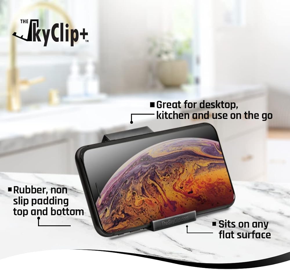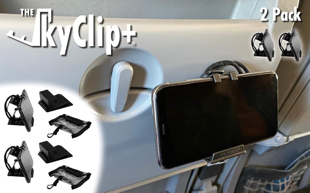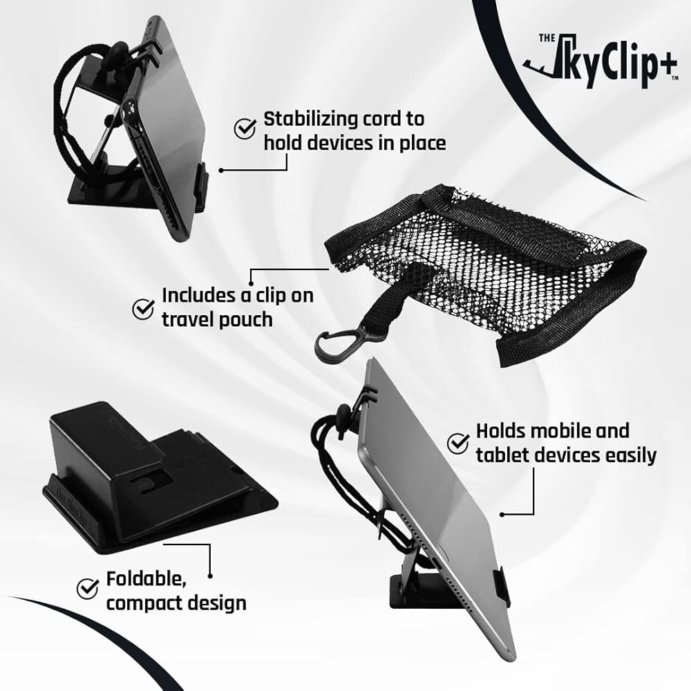 • حامل وحامل للهاتف الخلوي للسفر - متوافق مع جميع الأجهزة المحمولة والأجهزة اللوحية، SkyClip+ هو أفضل حامل جهاز محمول مثبت في العالم للسفر بالطائرة أو القطار. كما أنه خيار رائع عند الاسترخاء بجانب حمام السباحة أو العمل في المكتب أو الاسترخاء في المنزل. قابل للطي ومصمم ليناسب جيبك أو حقيبتك، يتيح SkyClip+ للمسافرين العمل أو اللعب أثناء التنقل. بغض النظر عن المكان الذي تتجه إليه، فإن SkyClip+ هو الأداة المثالية لدعم هاتفك الذكي وتجنب عنق النص.