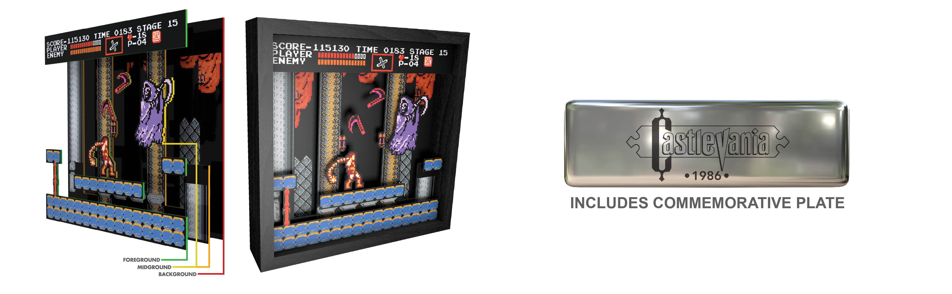 Simon takes up his whip again to immortalize this iconic Castlevania battle against the Grim Reaper. Display the most iconic moments of gaming with these officially-licensed shadow boxes created to uniquely show your love of gaming.