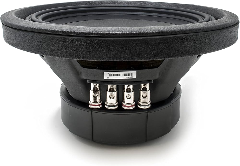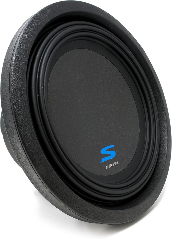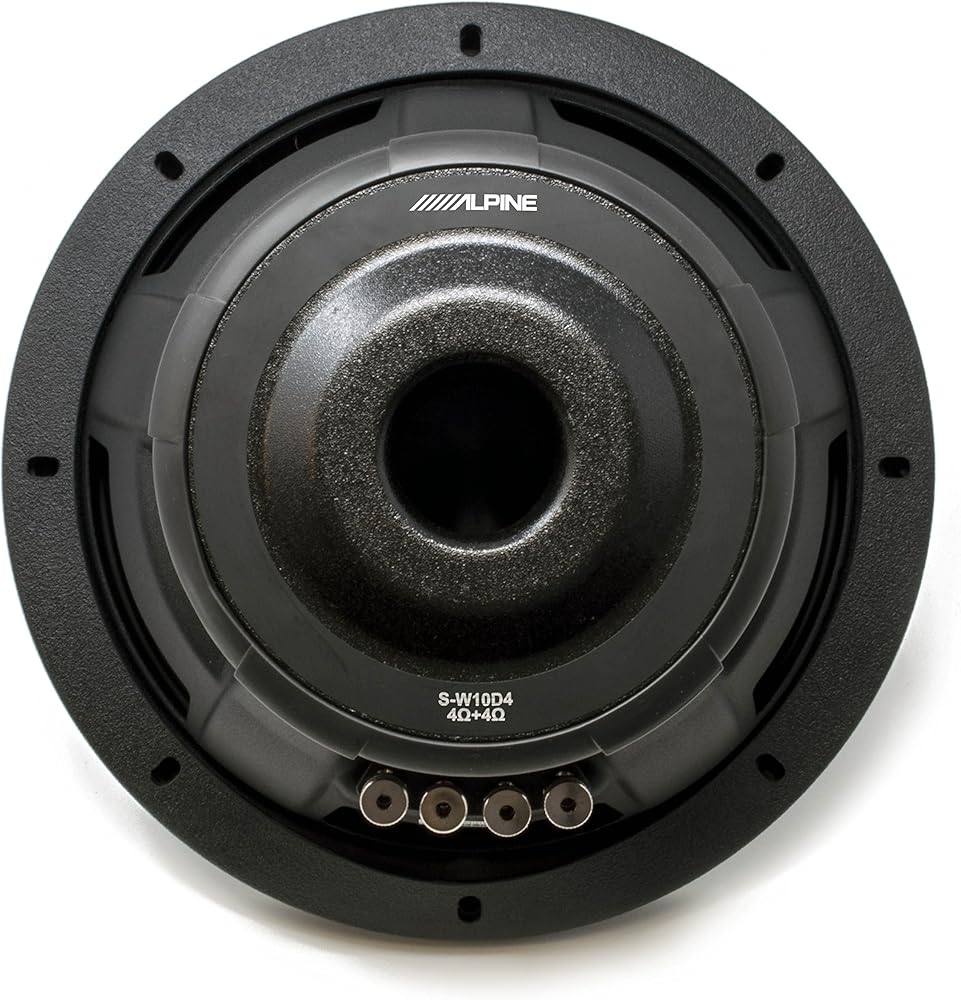 Alpine S-W10D4 S-Series 10" Subwoofer with Dual 4-Ohm Voice coils. The new S-Series subwoofers use a new design that's almost 1-inch shallower than their predecessors, thereby making all the models good candidates for systems with limited space. The subwoofers also have an improved power rating of up to 600W RMS power handling. Features: High Amplitude Multi-Roll Surround High Strength Steel Frame Perimeter venting with airflow management system High-excursion underhung voice coil configuration Compound radius curve extended pole geometry Airflow optimized dual flare pole vent 65mm voice coil with high-temp 5-layer dvc winding on aluminum former high-grade strontium ferrite magnets 8-AWG push terminals with voice coil configuration jumpers Progressiver spider with reinforced tinsel leads Concealed mount gasket Reinforced parabolic cone structure with pulp/Kevlar con & PP/Mica/Talc Dustcap 15MM Xmax 64mm Xmech 600W RMS 4.7" mounting depth 10-9/16" Cutout Diameter Power handling: 250-600W RMS Sealed Enclosure range: .55-1.0 ft^3 Vented Enclosure Range: 1.0-1.5 ft^3 Vented tuning range: 32-37Hz