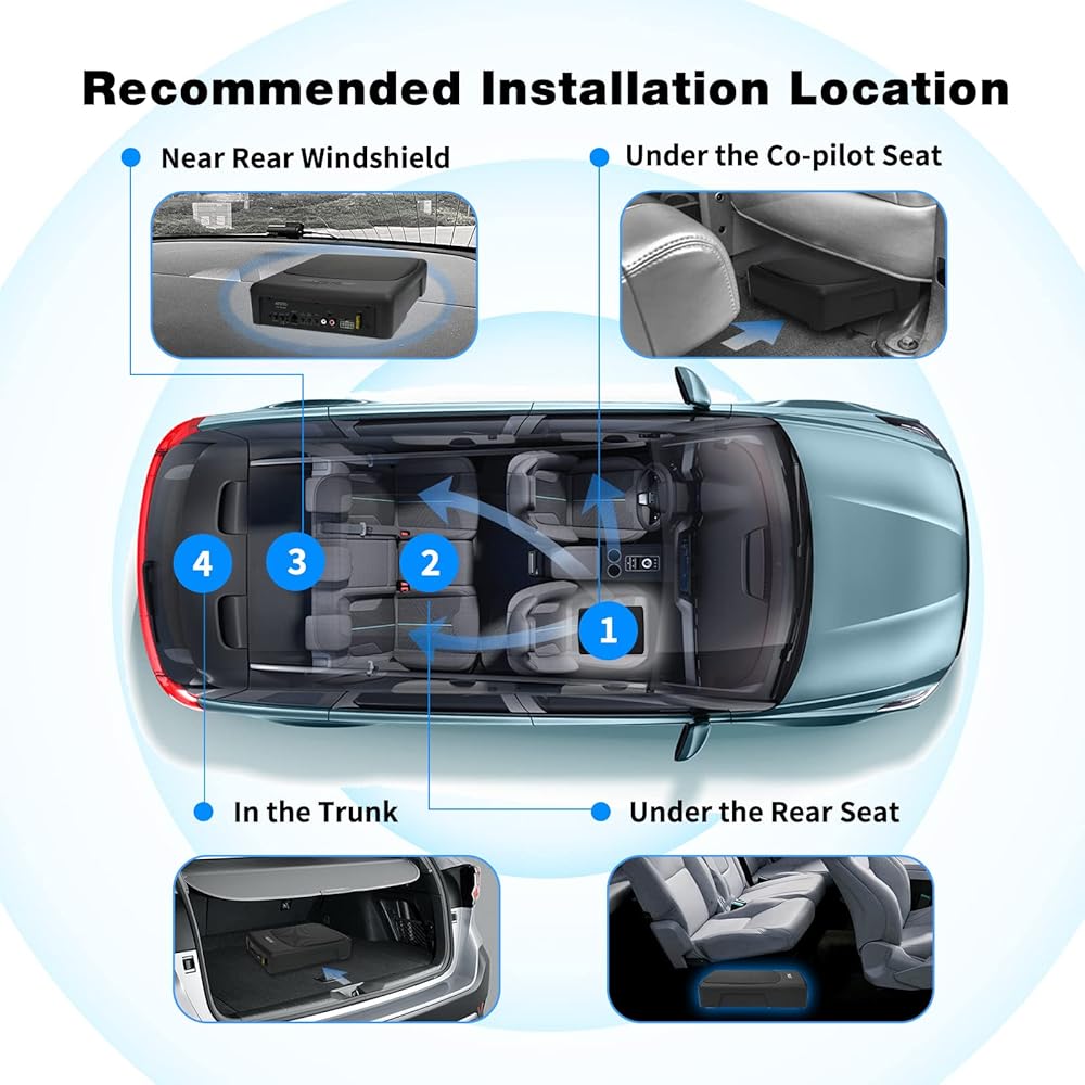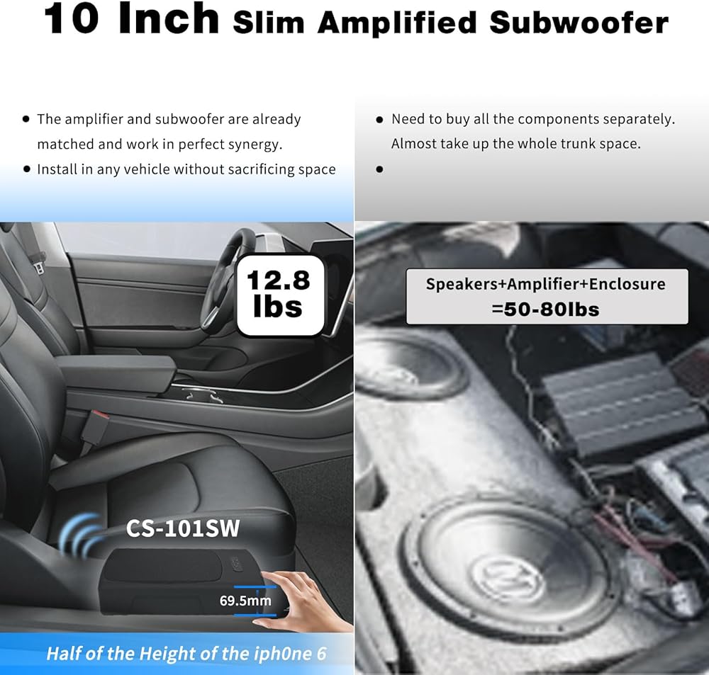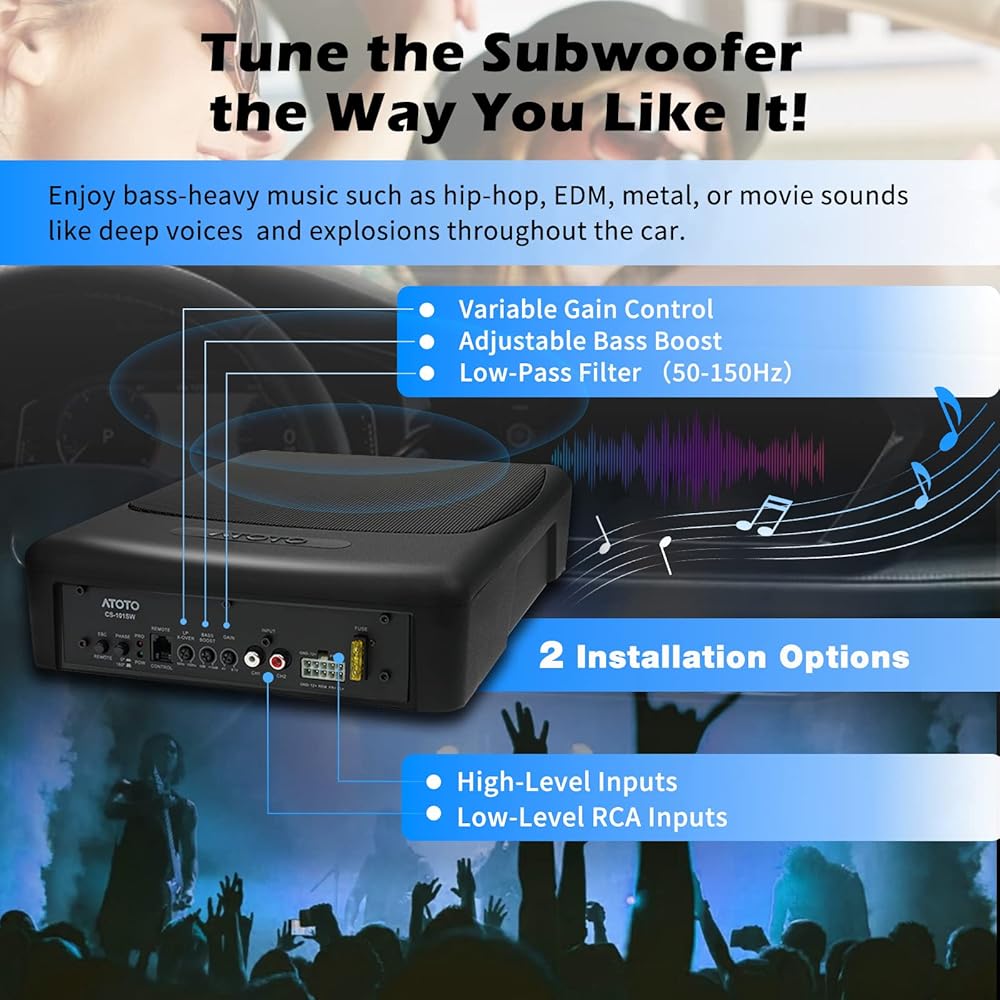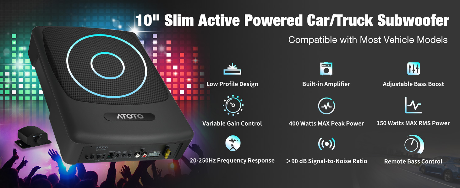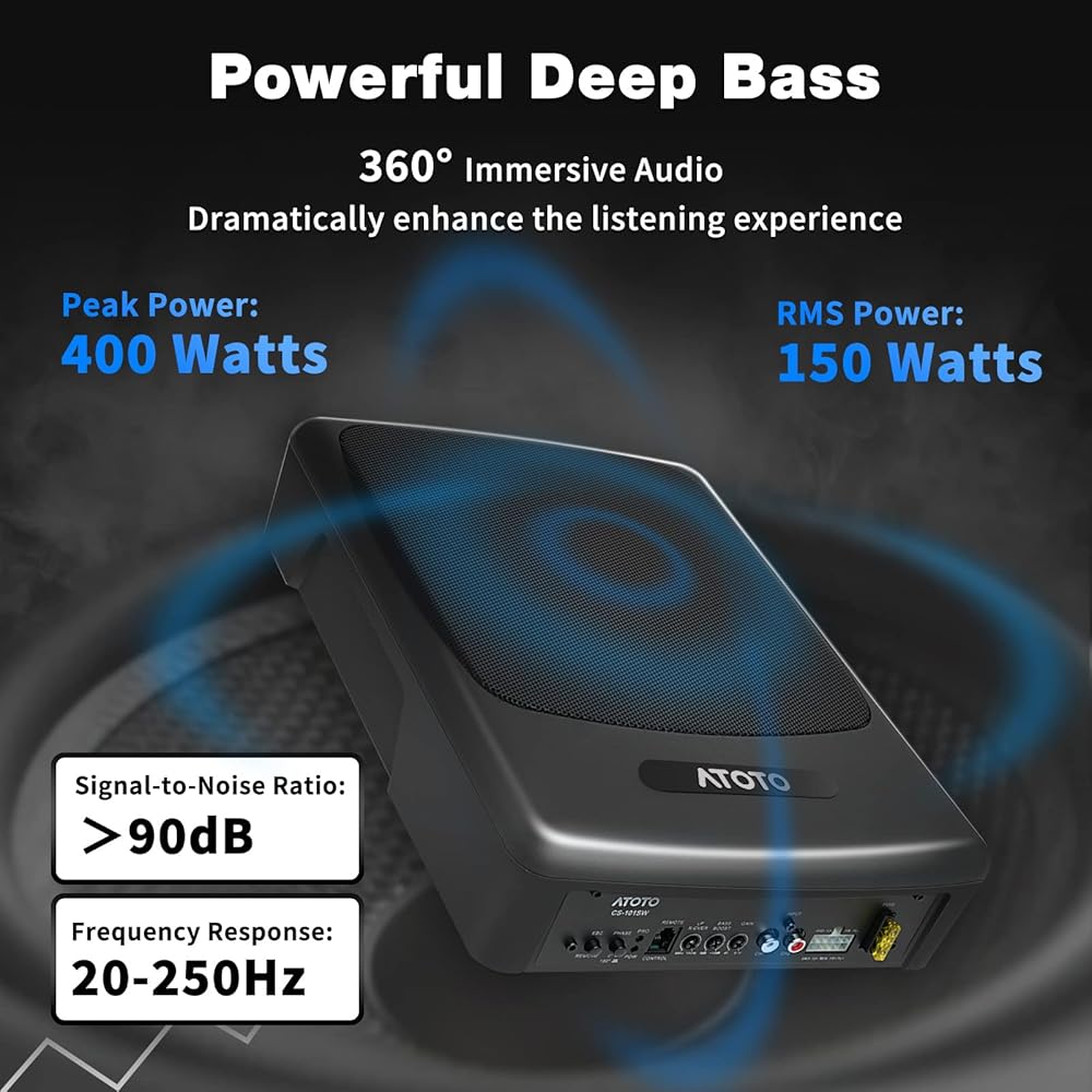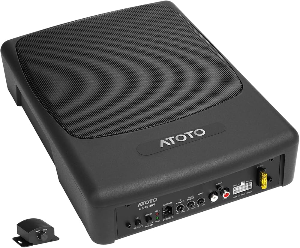 ATOTO CS-101SW مضخم صوت سيارة نحيف يعمل بالطاقة مقاس 10 بوصات مع أمبير مدمج، مضخم صوت مدمج تحت المقعد، صوت سيارة 400 وات مع مدخلات منخفضة وعالية المستوى، جهاز تحكم فرعي عن بعد