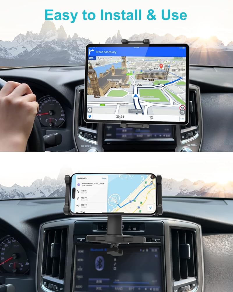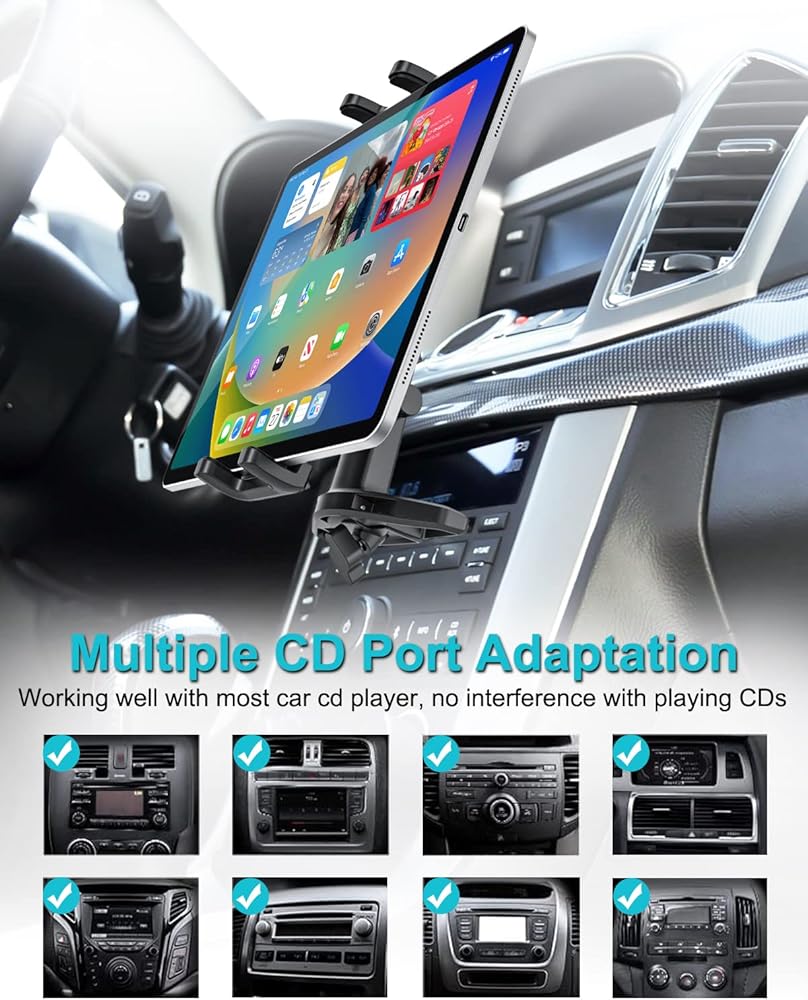 فتحة CD لحامل الكمبيوتر اللوحي في السيارة، حامل قرص مضغوط بذراع قابل للتعديل، حامل هاتف CD يدور 360 درجة لجهاز iPad Pro 12.9 Mini Air، سلسلة Galaxy Z Fold، علامات التبويب، iPhone، المزيد من الأجهزة مقاس 4-13 بوصة