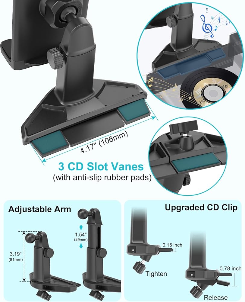 【تطبيق واسع】يتميز حامل الكمبيوتر اللوحي CD المحدث بنطاق تعديل أكبر (0.15-0.78 بوصة/ 38-20 مم)، مما يجعله مناسبًا لمعظم الأقراص المضغوطة الموجودة في السوق. طالما تم تحميل القرص في القرص المضغوط مقدمًا، لن يؤثر ذلك على التشغيل العادي للقرص المضغوط.
