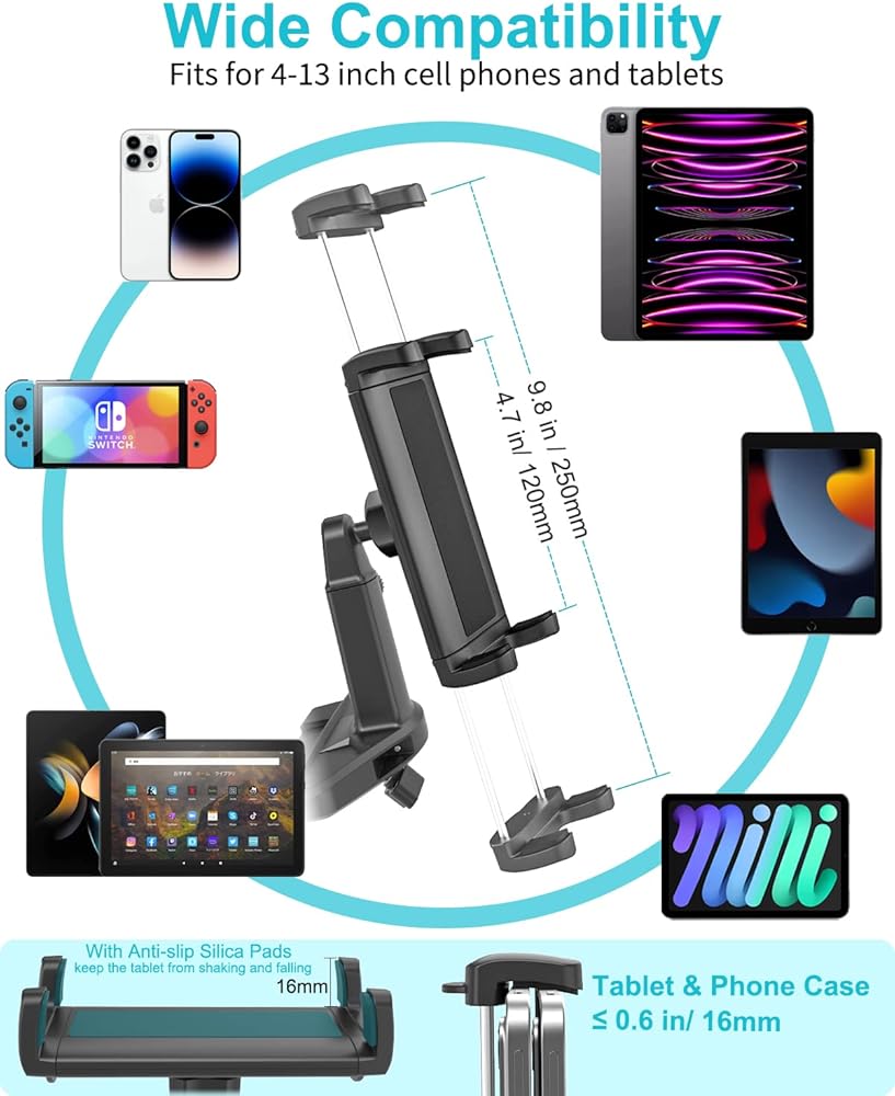 【زاوية مرنة وارتفاع قابل للتعديل】تم تجهيز مشبك الكمبيوتر اللوحي ذو فتحة القرص المضغوط بمفصل كروي دوار 360 درجة، ويمكن تمديد الارتفاع 1.54 بوصة (39 مم)، مما يسمح لك بتعديل وضع العرض بسهولة.