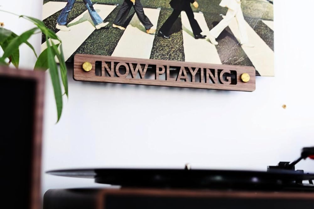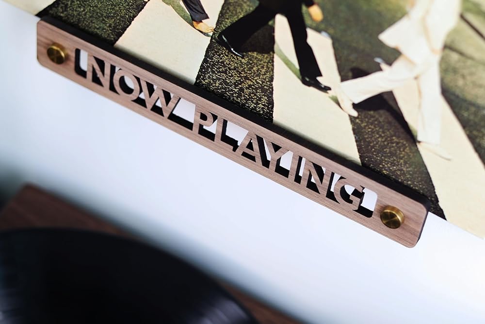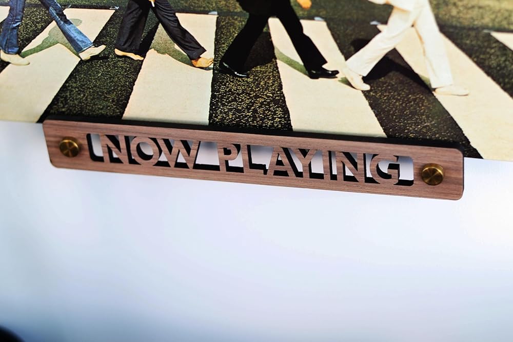 Deluxe Vinyl Record Now Playing Stand - The Ultimate Display for Music Enthusiasts Elevate your music listening experience with our exquisite Vinyl Record Now Playing Stand, a must-have for any vinyl enthusiast. Crafted with precision and attention to detail, this stand is not just a vinyl record holder stand; it's a statement piece that brings a touch of retro elegance to your space. Display Your Favorite Albums: The unique ""Now Playing"" cutout design in the center is the hallmark of this vinyl display stand. It beautifully frames the album artwork of your current record, making it a focal point in your room. This feature distinguishes it from typical record stands, adding an artistic flair to your music listening area. Organize Your Collection: This versatile vinyl record holder stand also serves as a sleek vinyl record accessories organizer. Keep your space clutter-free and stylish while indulging in your favorite tunes. Easy and Stylish Mounting: Installation is a breeze with two one-inch gold standoffs, adding a luxurious touch to this record shelf wall mount. These standoffs ensure that your vinyl now playing stand is not only secure but also adds an aesthetic charm to your wall. High-Quality Craftsmanship: Made from ¼” thick walnut wood, this vinyl record holder wall mount is designed to last. The rich texture of the wood complements any interior decor, making it a perfect addition for both modern and classic settings. Proudly Made in the USA: Embrace the superior quality and craftsmanship of American-made products with this vinyl accessories masterpiece. Multi-Functional: Whether you use it as a vinyl record holder now playing display or a vinyl now playing wall mount for your most treasured records, this stand is versatile and functional. Perfect for Any Space: Ideal for your living room, music studio, or any space where music is cherished, this now playing wall mount is more than just a holder; it's a tribute to the timeless beauty of vinyl records.