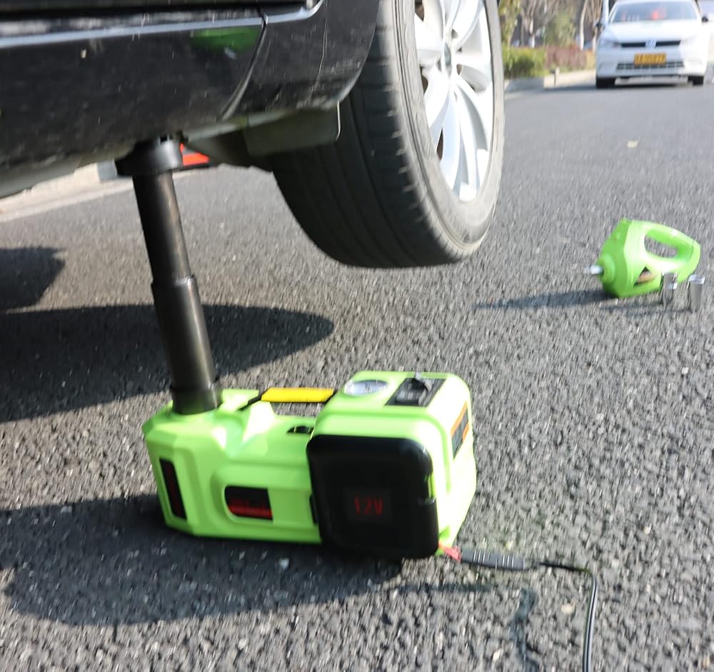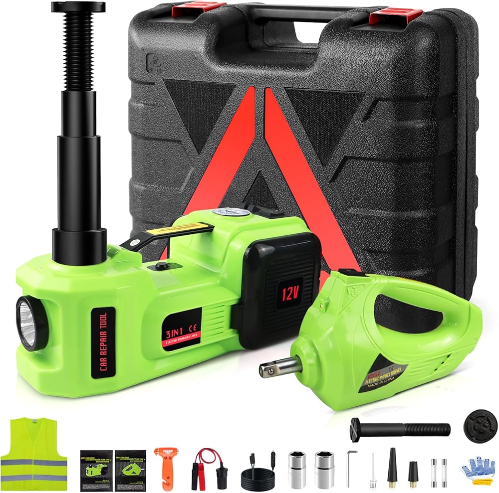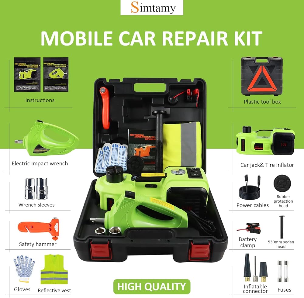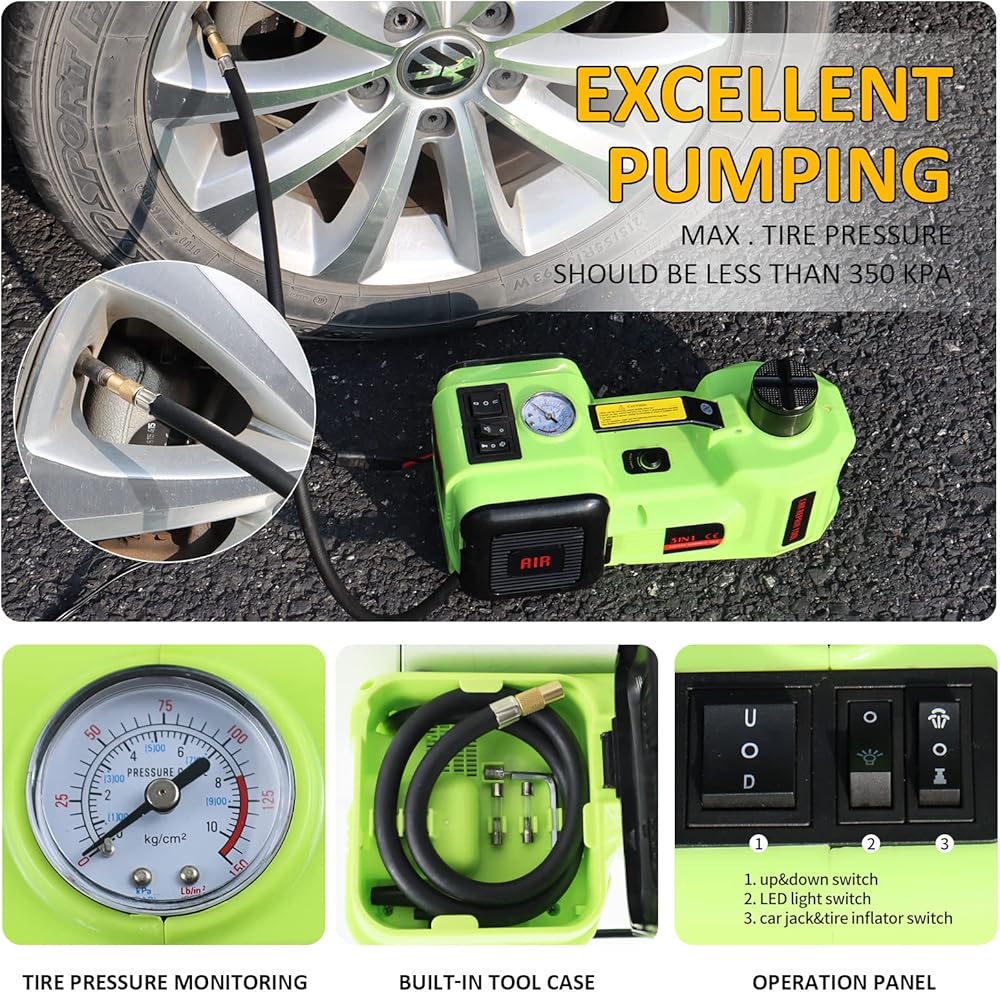 [مجموعة إصلاح السيارة المتنقلة] رافعة هيدروليكية كهربائية 5 طن، ومنفاخ الإطارات ومفتاح ربط الصدمات، كل ذلك في حقيبة أدوات واحدة، تلبي جميع احتياجاتك لتغيير الإطارات أو حالات الطوارئ على الطريق. مدعوم بولاعة السجائر أو بطارية السيارة أو أي مصدر طاقة آخر بتيار مستمر 12 فولت، تلقائي بالكامل، يوفر الوقت والطاقة مقارنة بالمقبس اليدوي. خيار رائع لتخزينه في صندوق السيارة في حالات الطوارئ.