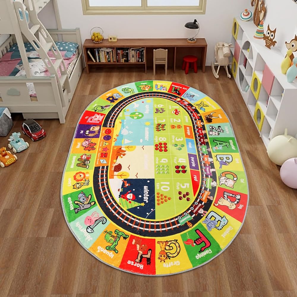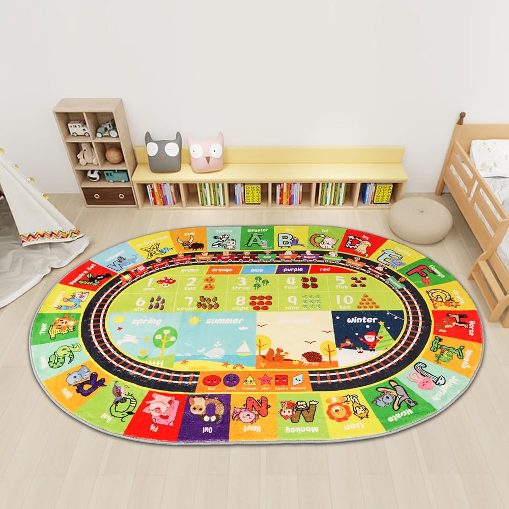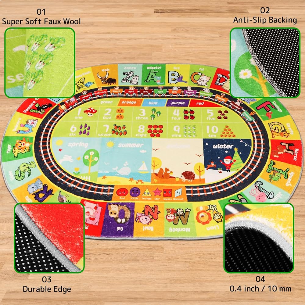 • ❤️【سجادة تعليمية بيضاوية للأطفال】❤️تم تصميم سجادة التعلم المبكر البيضاوية هذه لتأسر العقول الصغيرة بتنوعها الغني من العناصر التعليمية. تحتوي على حيوانات وحروف ABC وأرقام وأشكال وخضروات وأشهر ومواسم وأكثر من ذلك، مما يعزز التطور الإدراكي والحسي المبكر؛ مثالية لمرحلة ما قبل المدرسة