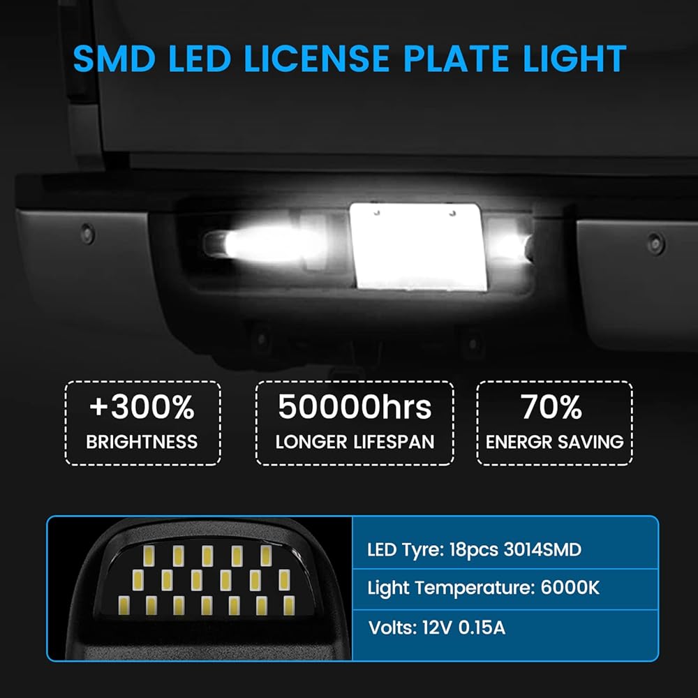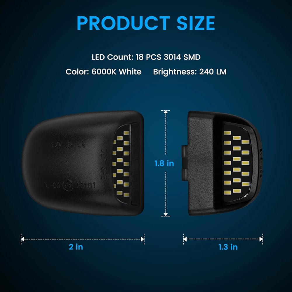 These license plate lights feature 18 SMD 6,000K white 3014 LED chips that are incredibly bright and provide up to 300% more illumination than factory lights.They maximize the illumination of the rear end while not blinding the backup camera.
