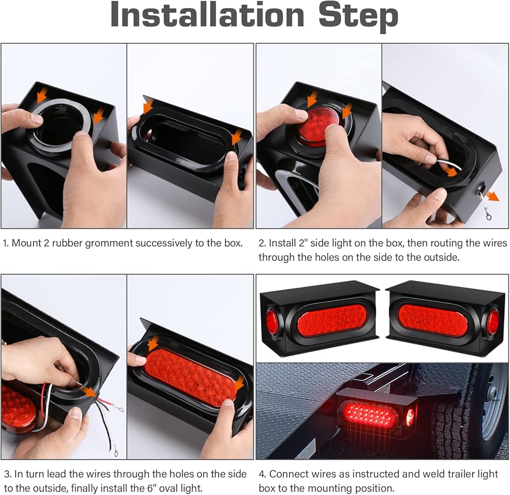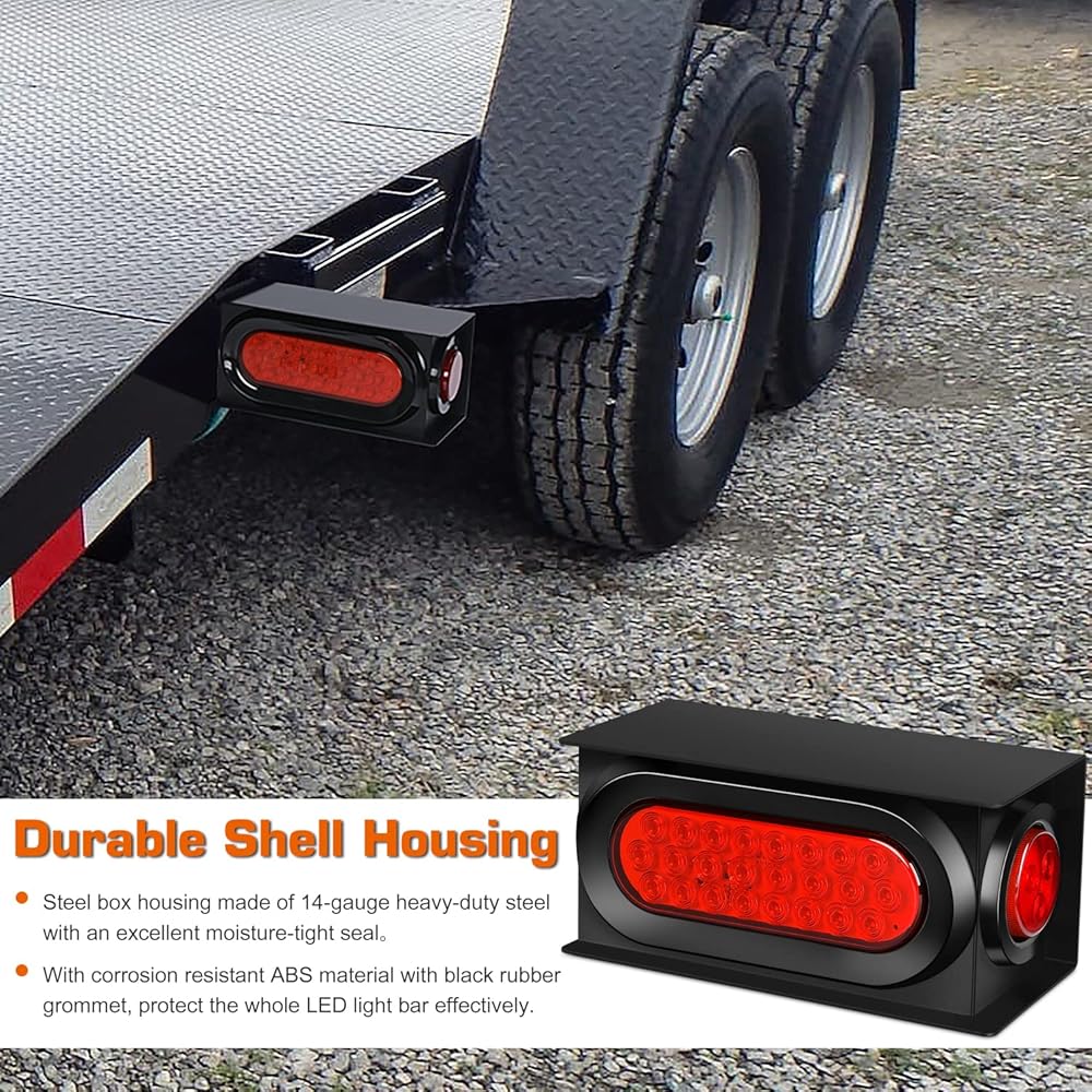 مجموعة صندوق حماية ضوء ذيل المقطورة الفولاذية: تتضمن صندوقين معدنيين، 2 مصباح إيقاف/ذيل بيضاوي مقاس 6 بوصات و2 مصباح تحديد جانبي مستدير مقاس 2 بوصة مع موصلات أسلاك وحلقة تثبيت.
