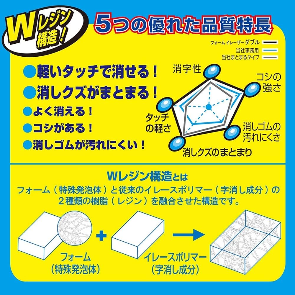 • Feature 1: W resin construction of foam (special foam) and erasing polymer (erasing ingredient)