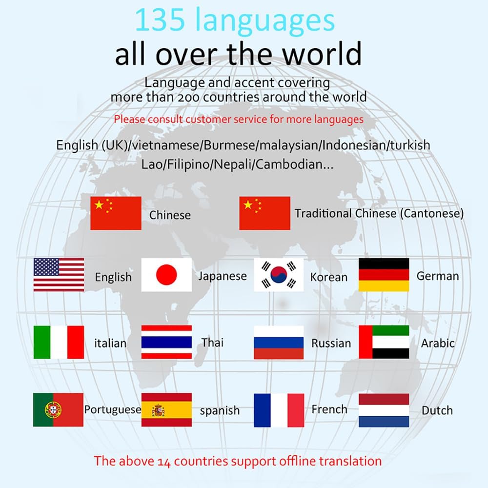 【ترجمة دقيقة عبر الإنترنت】: يدعم جهاز المترجم الترجمة الصوتية الفورية في اتجاهين، والتي يمكن أن تدعم الترجمة عبر الإنترنت بما يصل إلى 135 لغة بدقة 98% وسرعة ترجمة 0.1.
