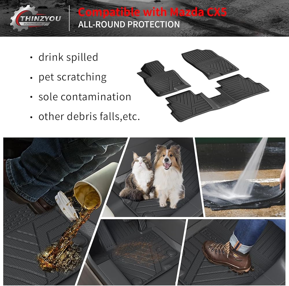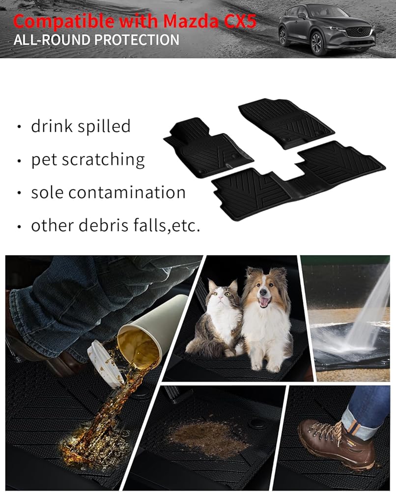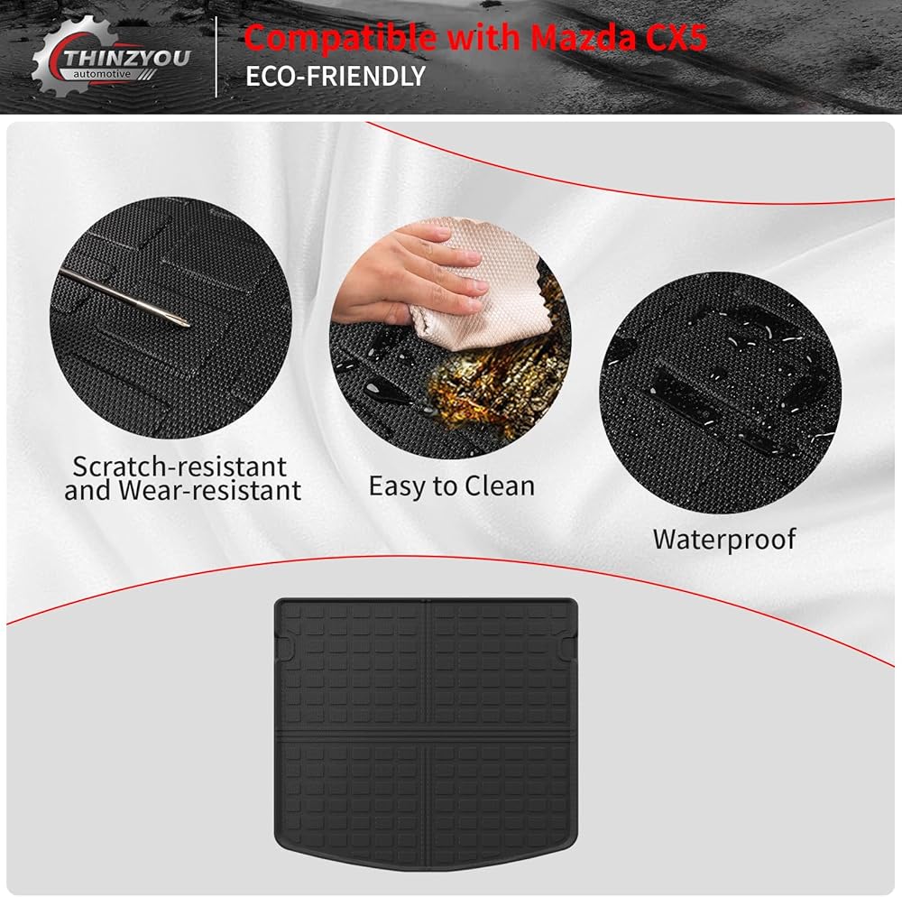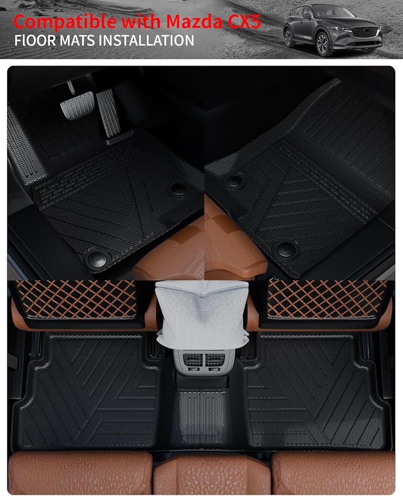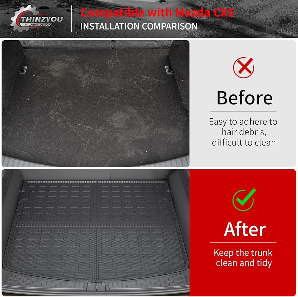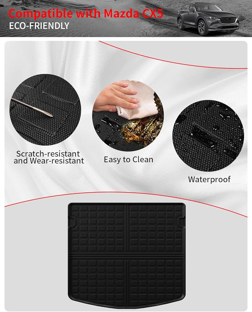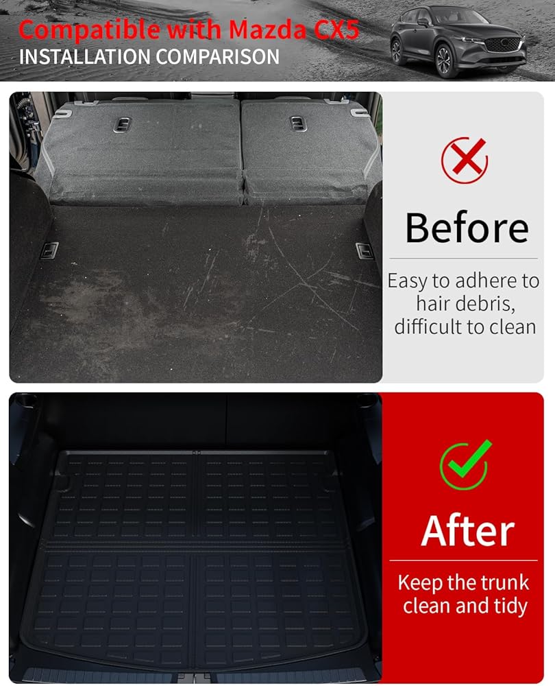 • التثبيت: تركيب سريع وبسيط، يتم تركيبه مباشرة في Mazda CX-5 وسهل الإزالة للغاية. يتضمن سجادة صندوق واحدة، وثلاث سجادات لمسند الظهر.