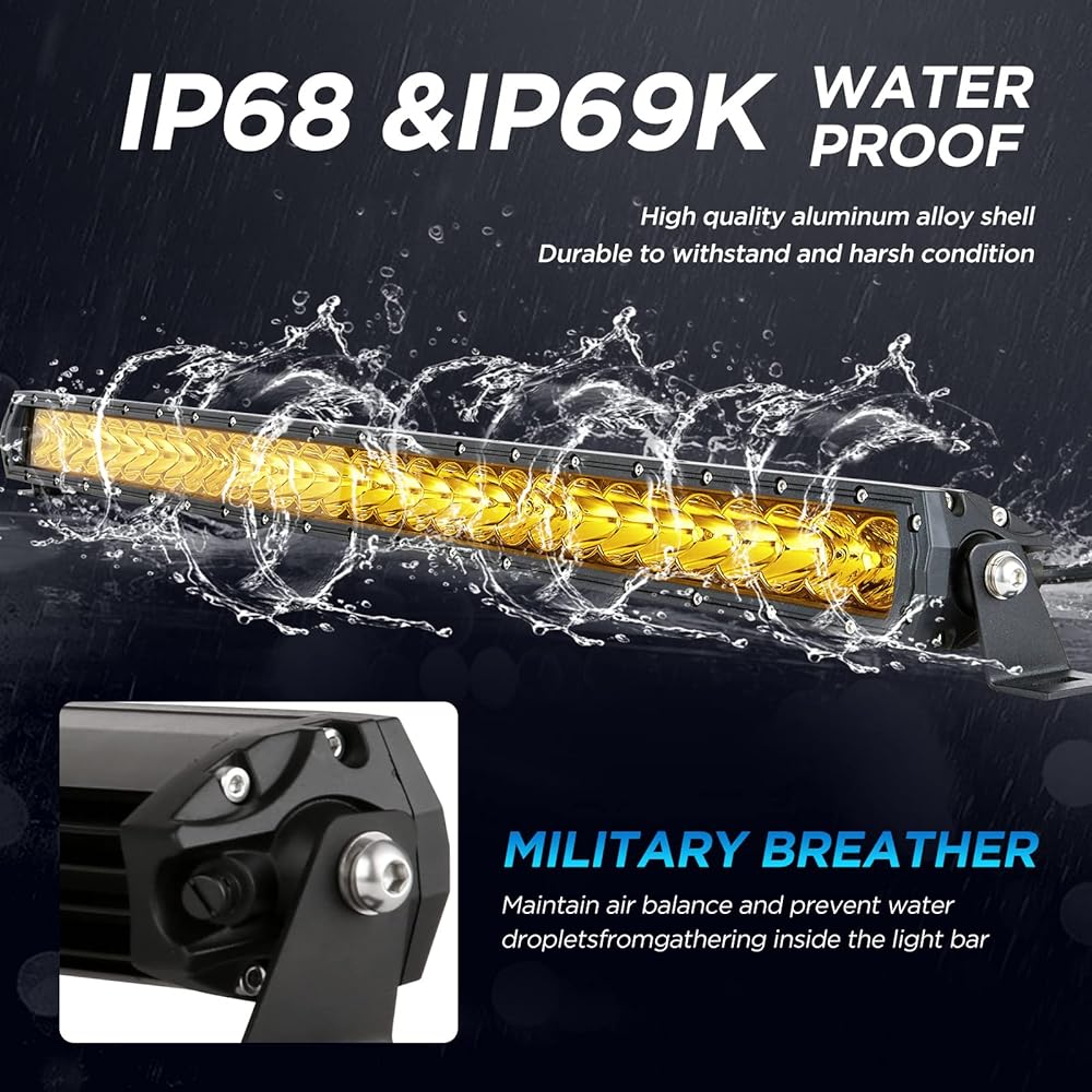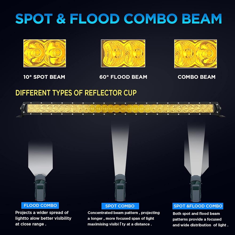 【تأثير إضاءة فعال】تم اعتماد مزيج من تصميم البقع والفيضان. ينتقل الشعاع الموضعي بعيدًا جدًا وله عرض جميل. يمكن لشعاع الفيضان أن يضيء الأماكن القريبة على نطاق واسع. يصدر شريط الضوء ضوءًا كهرمانيًا فائق السطوع. امنح رؤية آمنة في معظم الأحوال الجوية السيئة مثل الأيام الممطرة والأيام الضبابية والأيام الثلجية، مما يجعل القيادة أكثر أمانًا.