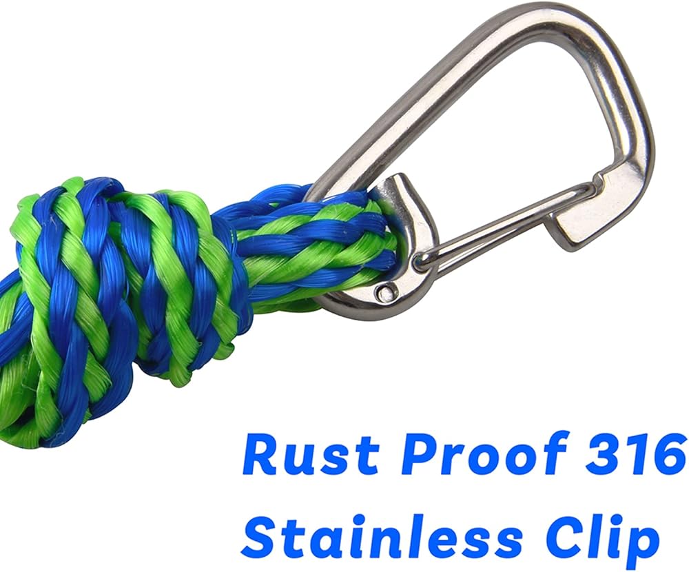 تصميم عملي - تم تصميمه بمشبك من الفولاذ المقاوم للصدأ 316 على أحد الأطراف لربطه بعيون التزلج والمرابط وعيون القوس وحلقات الإرساء. الحلقة المقسمة المخصصة مقاس 10 بوصة على الطرف الآخر مخصصة لربطها بمرابط الرصيف، وهي أكثر ملاءمة للاستخدام.