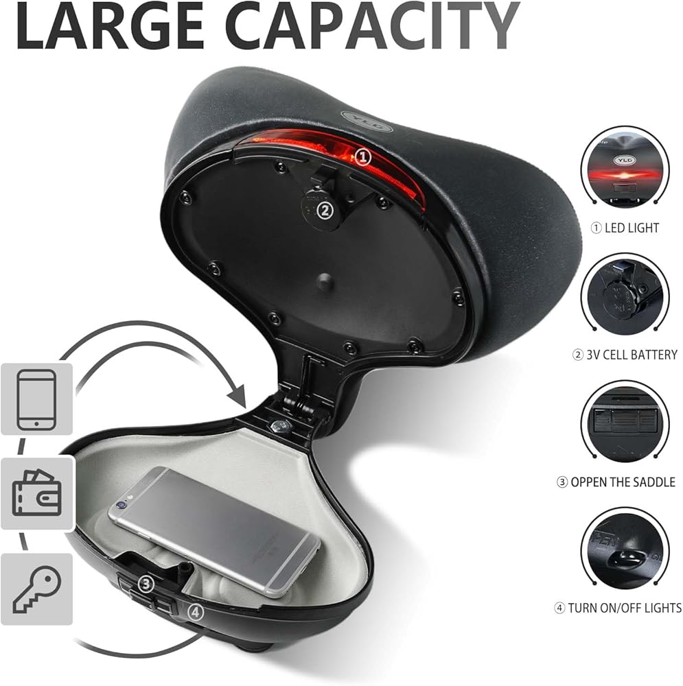 تصميم حاصل على براءة اختراع وشكل خاص مع مساحة تخزين: يتميز مقعد الدراجة الفريد هذا بمساحة تخزين واسعة يمكن أن تناسب جميع الأدوات والمفاتيح والهاتف وغيرها من الضروريات لرحلتك.
