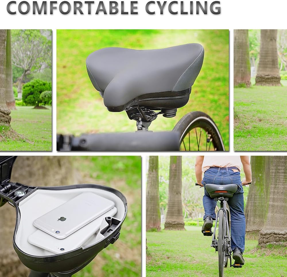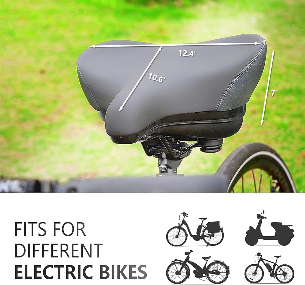 تصميم واسع ومريح (13.8 × 10.2 × 7.48 بوصة): تتميز ملحقات الدراجة الإلكترونية بتصميم قوس يشبه الجناح حاصل على براءة اختراع يزيد من مساحة الجلوس ويتوافق مع شكل الأرداف. يحتوي مقعد الدراجة هذا على كرات مطاطية مزدوجة تمتص الصدمات والاهتزازات، مما يضمن قيادة سلسة ومستقرة على أي تضاريس.