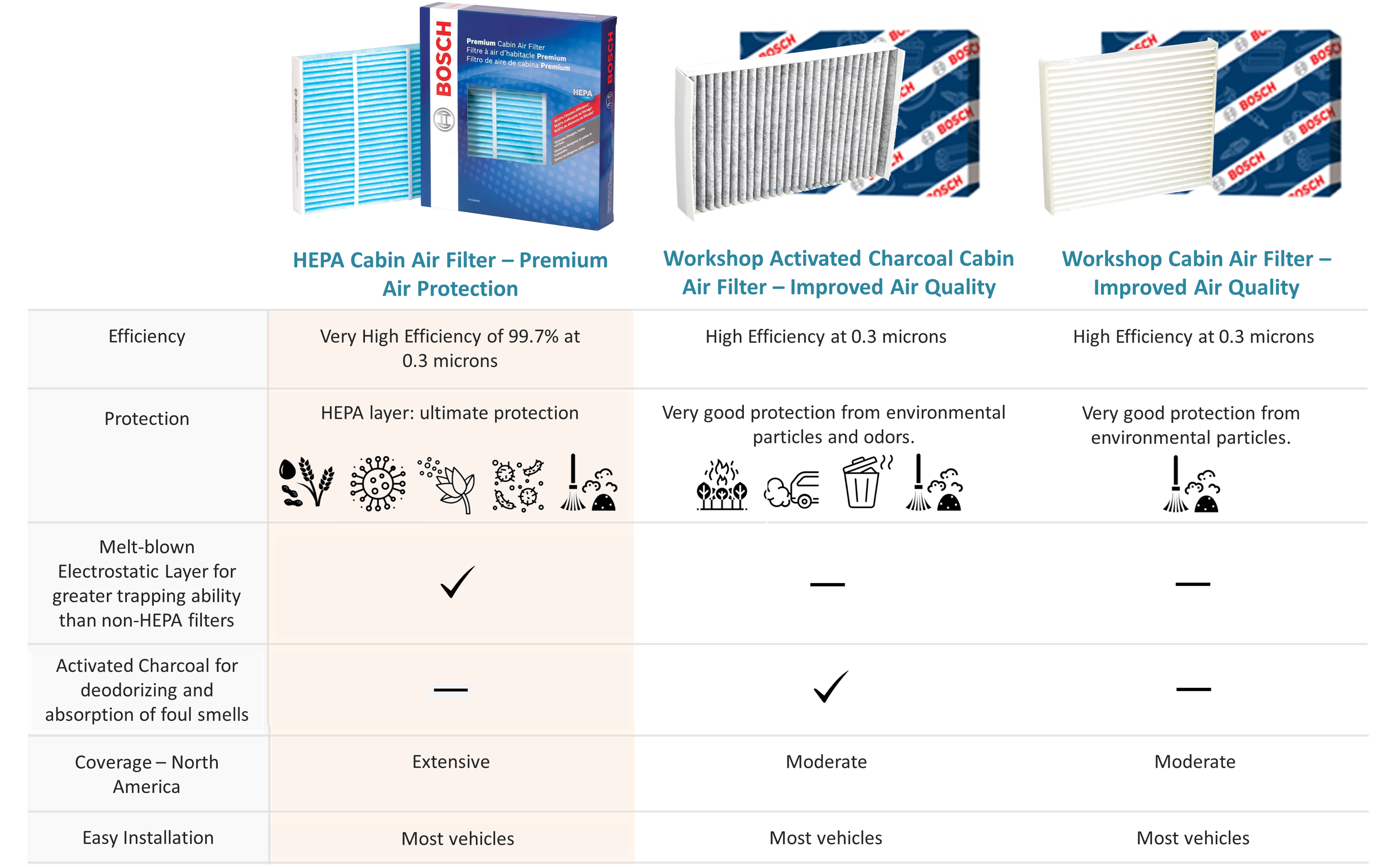 Bosch HEPA Premium Cabin Air Filters are designed and tested to meet High Efficiency Particulate Air (HEPA) standards based on ISO 29463-3:2011 and provide filtration efficiency of 99.97% at 0.3 microns