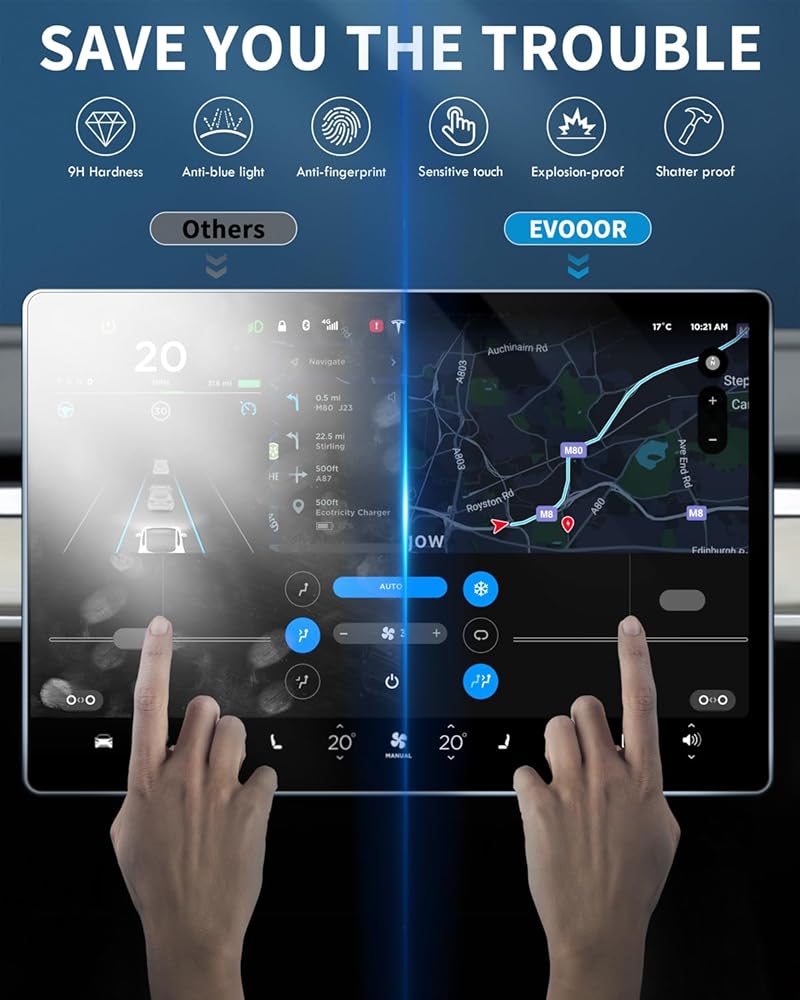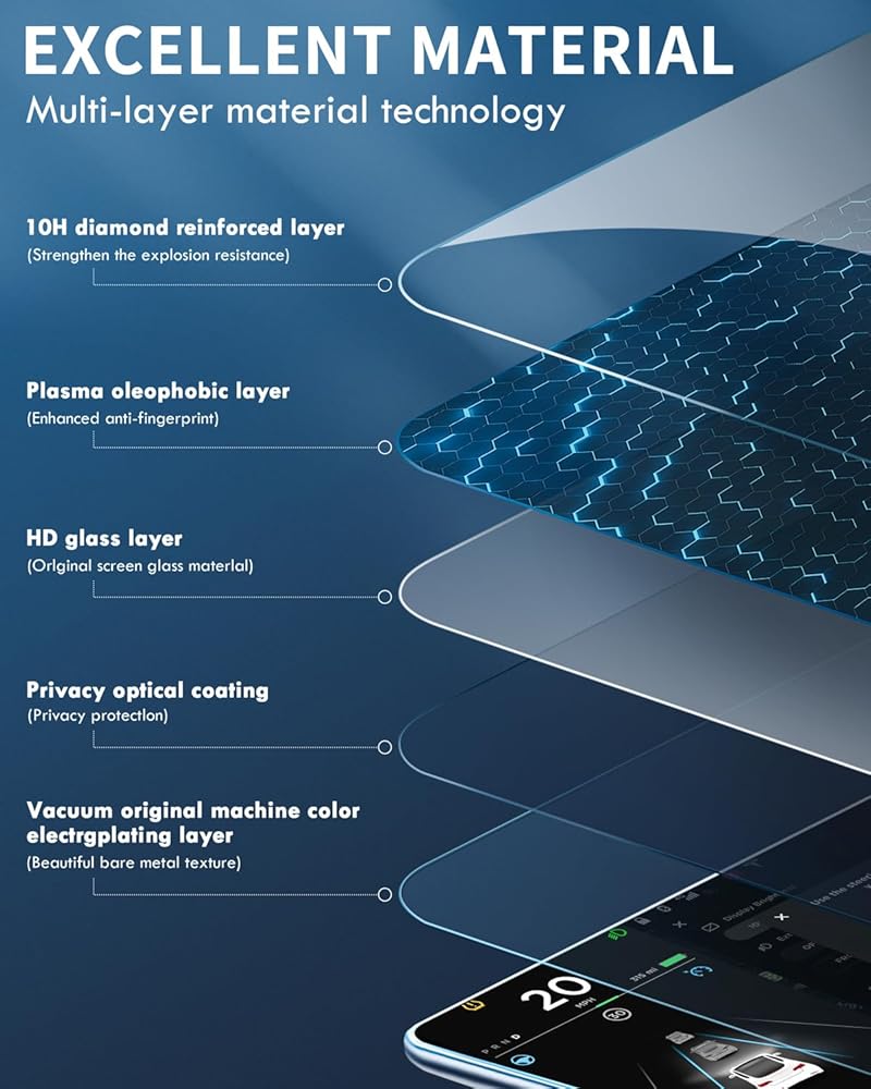 ملمس ناعم: زجاج رفيع للغاية 0.33 مم، استجابة سريعة دون التأثير على لمسة السيارة الأصلية، تشغيل سلس دون ترك آثار، منع خدوش الشاشة بشكل فعال.
