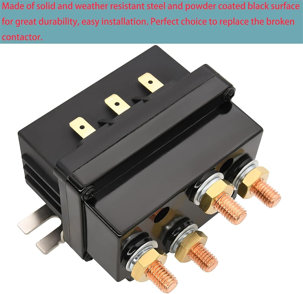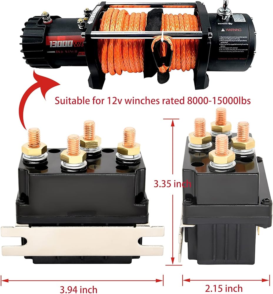 الجهد الكهربي المقدر: 12 فولت، التيار المقدر 500 أمبير، السعة: 8000-15000 رطل. 12 فولت 500 أمبير مرحل لولبي للونش متوافق مع معظم العلامات التجارية للروافع 8000-15000 رطل، متوافق مع مركبات الدفع الرباعي، ATV، UTV، SUV، إلخ.