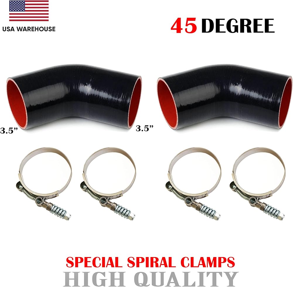 45 DEGREE Silicone Hose Black-Red INSIDE DIAMETER 3.5" or 89 mm LENTGH. 4 inch or 102 mm Thickness of WalL. 5 mm, 4 ply reinforced Size Tolerance. +/- 0.5 mm Bursting Pressure. 2 Mpa Working Pressure. 0.3 Mpa (43.5 PSI) to 0.9 Mpa (130.5 PSI) Working Temperature. -76°F (-60°C ) to +500°F (+260°C) Application Universal,such as Custom Turbo, Supercharger charge piping set up, custom compressor, inlet for turbocharged and supercharged cars, vehicles, boats etc. or T-bolt Clamps: Material: HIGH QUALITY 301 stainless steel Package 2 PCS silicone hose Reducer 4 PCS t-bolt clamp