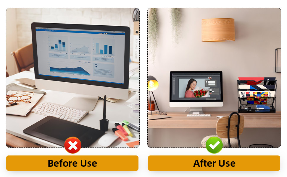 ✅توفير المساحة---يمكن لحامل الملفات المثبت على الحائط أن يساعدك على تحقيق أقصى استفادة من المساحة الرأسية والقضاء على الفوضى. يمكنك تركيب منظم الملفات على الحائط، أو وضعه على جانب خزانة الملفات أو الثلاجة أو أي معدن آخر شاء. إنه مناسب جدًا لمساعدتك في الحفاظ على كل شيء منظمًا ومريحًا في مكتبك أو منزلك