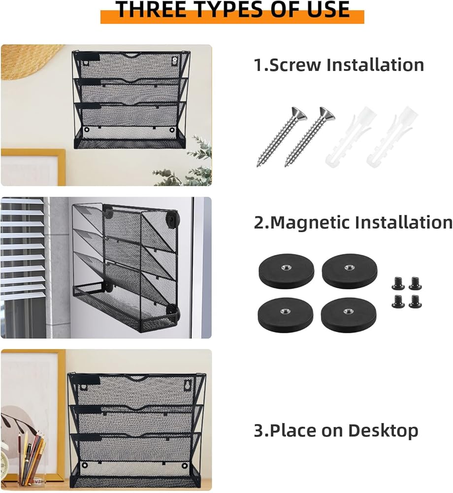 ✅حامل ملفات معدني مصنوع جيدًا --- منظم المستندات الحديث 2 في 1 مصنوع من هيكل شبكي معدني متين، يتميز بمقاومة الأكسدة ومقاومة الصدأ. لا يلزم التجميع. مجهزة بمسامير تثبيت و4 ألواح مغناطيسية، فهي متينة ويمكن استخدامها لسنوات عديدة. التصميم الأنيق مناسب لمنزل أو مكتب الجميع، مما يسمح لك بتنظيم وتخزين ضرورياتك اليومية بسهولة