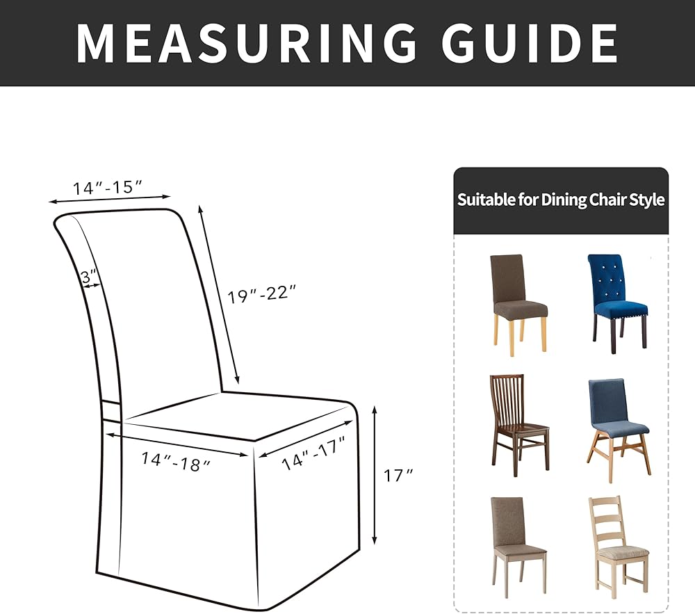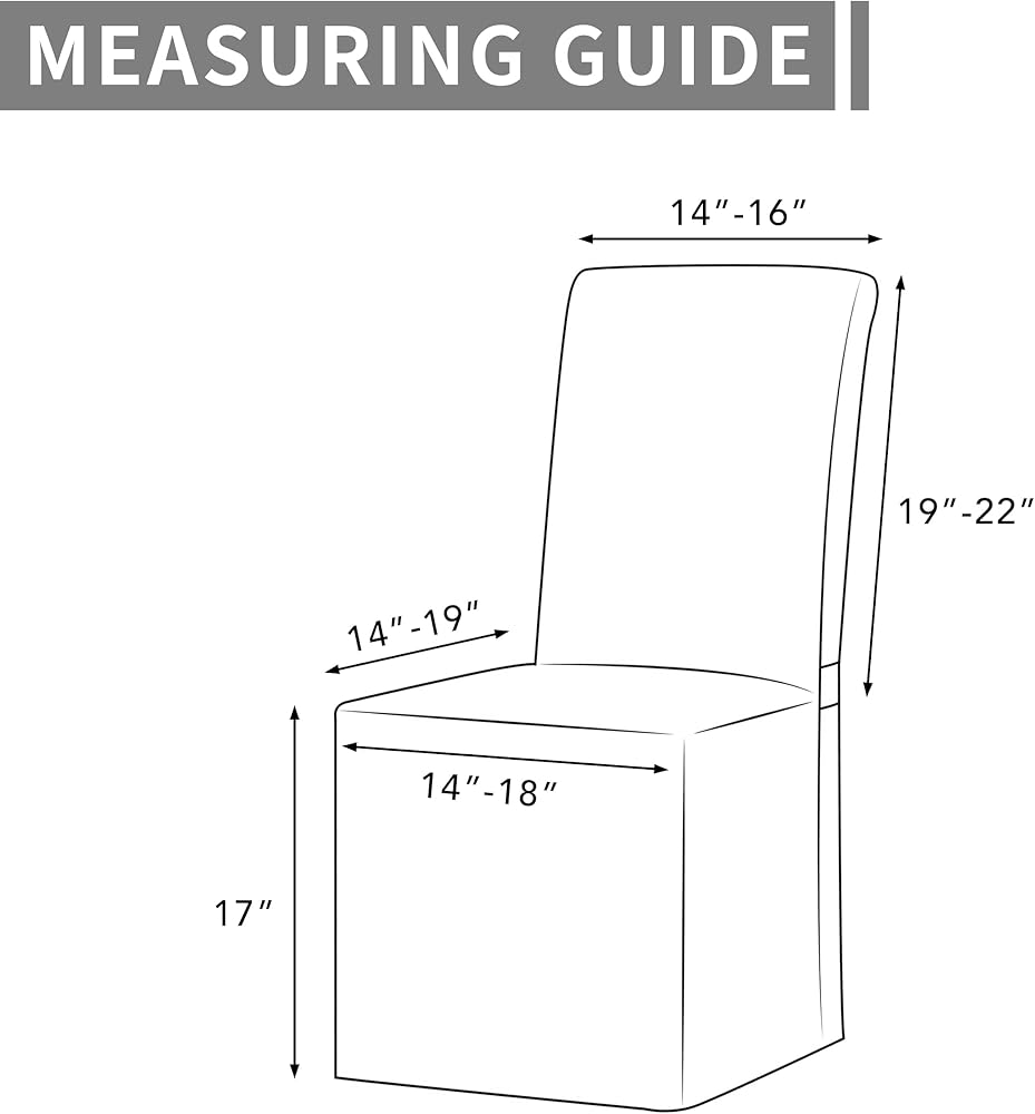 • مقاس عالمي: غطاء الكرسي يناسب كرسي البارسون العادي والعالي الظهر. ارتفاع ظهر الكرسي 19-22 بوصة وعرض ظهر الكرسي 14-16 بوصة. عرض مقعد الكرسي 14-18 بوصة والطول 14-19 بوصة. يبلغ ارتفاع تنورة غطاء كرسي الطعام 17 بوصة. يرجى قياس كراسيك قبل الطلب.