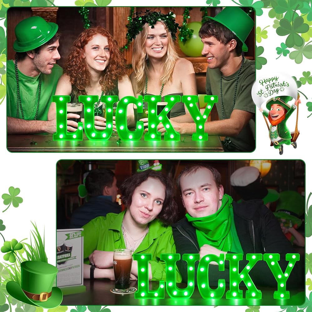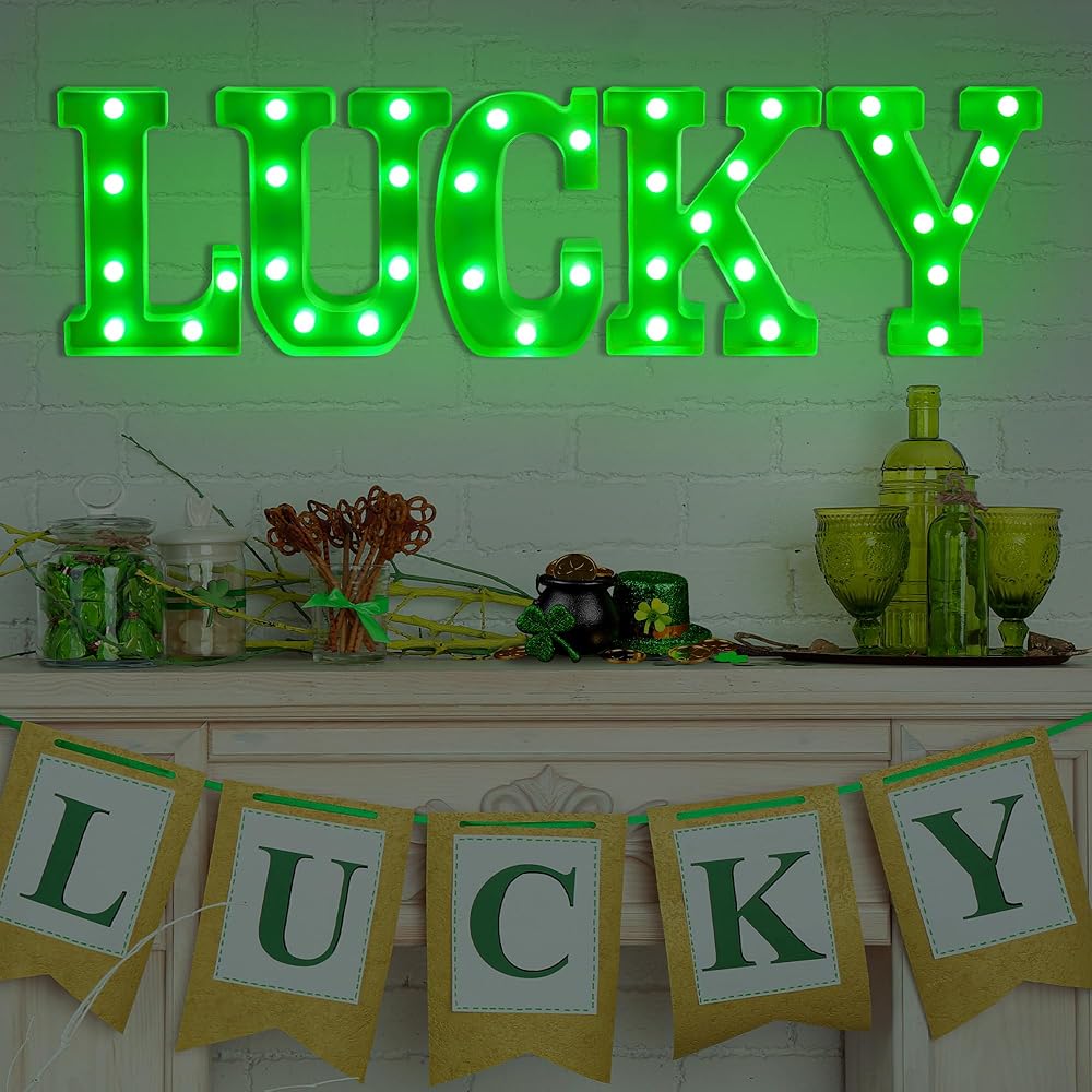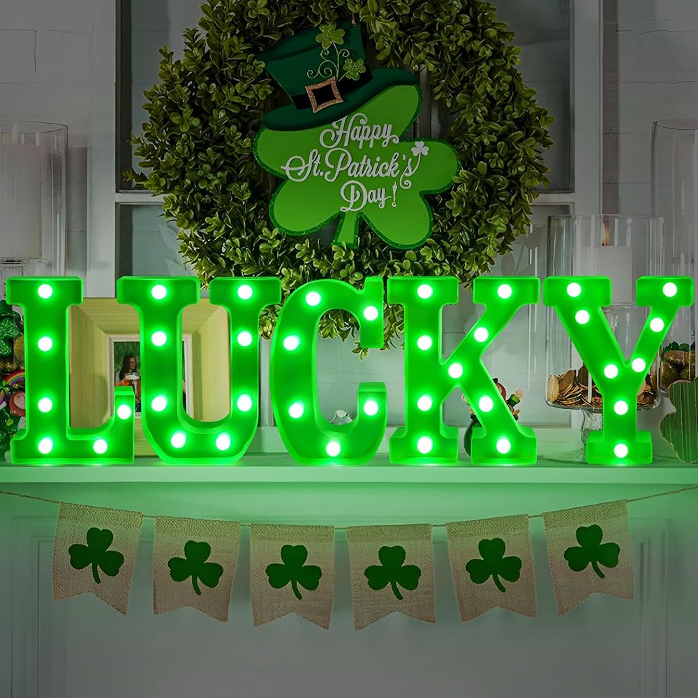 ديكور يوم القديس باتريك - هذه اللافتات المضيئة "LUCKY" مناسبة لحفلات المنزل في يوم القديس باتريك في الداخل/الخارج، وغرفة المعيشة، وغرفة النوم، والطاولة، والمدفأة، والرف، وأي مكان آخر.